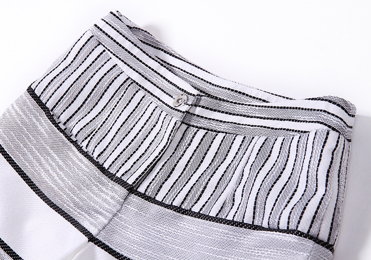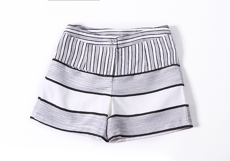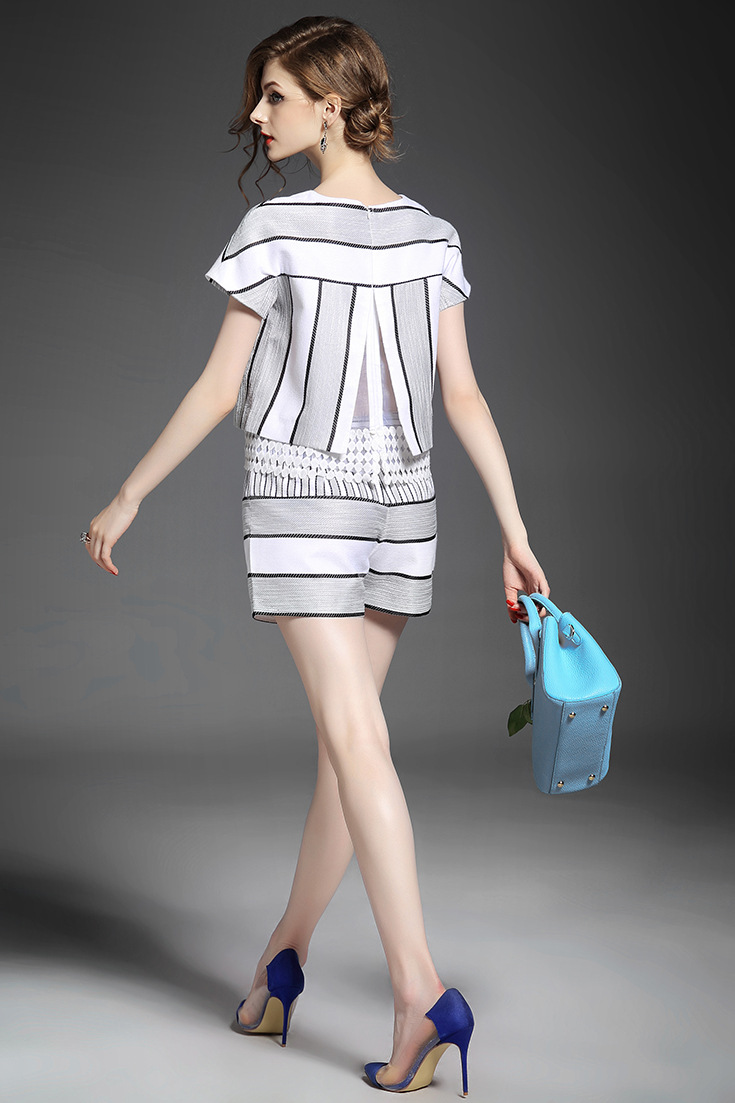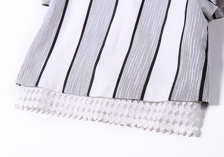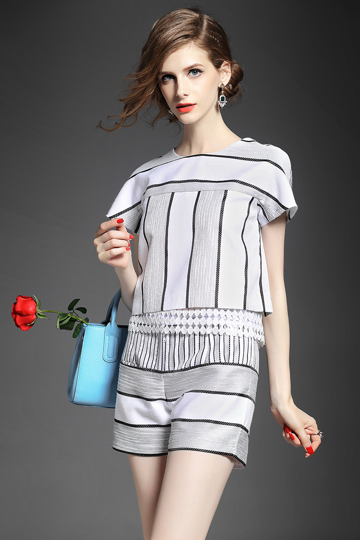2015欧洲站夏季女装 圆领水溶绣花拼接短上衣+条纹阔腿短裤套装
