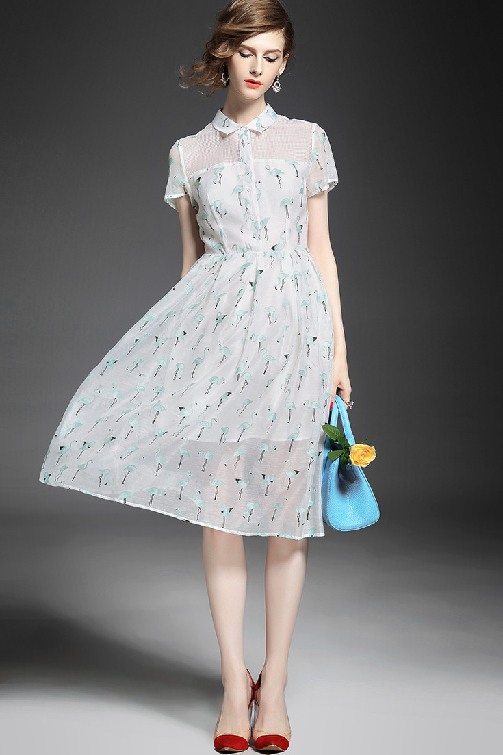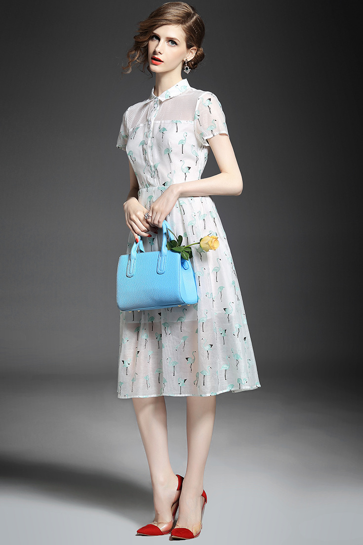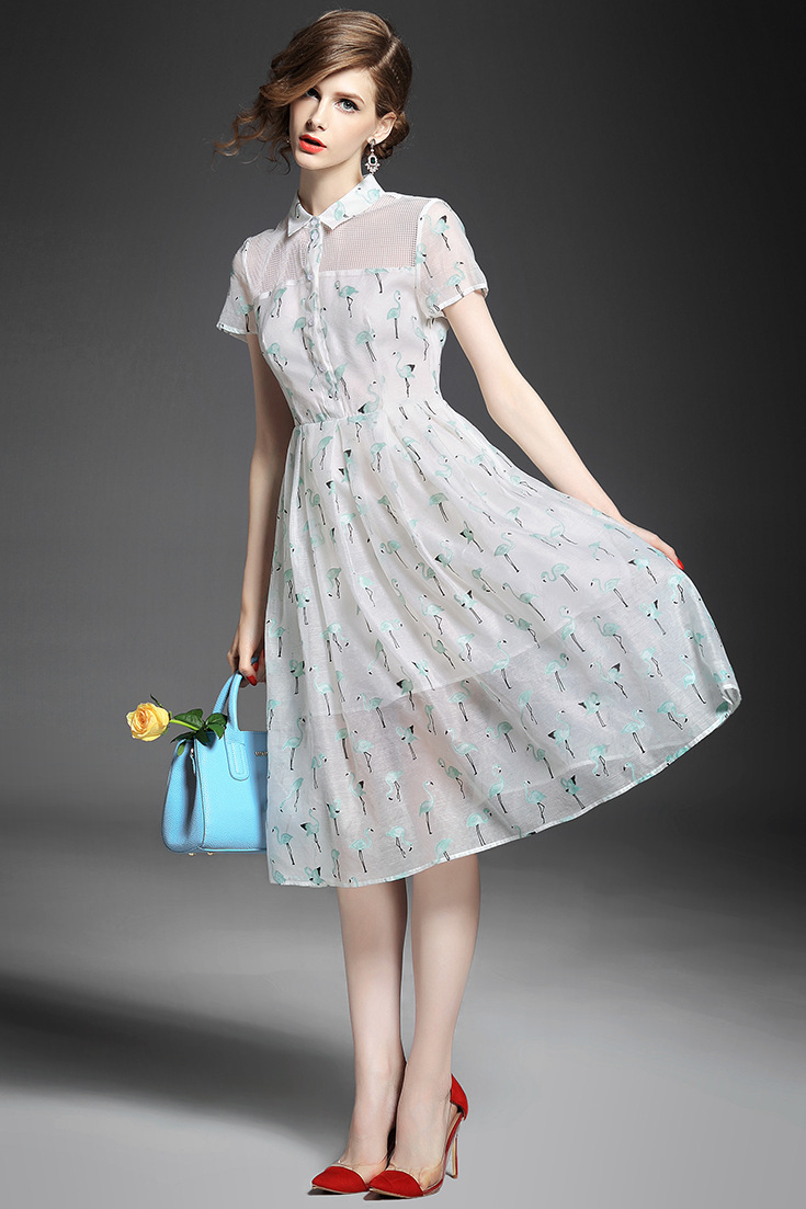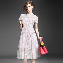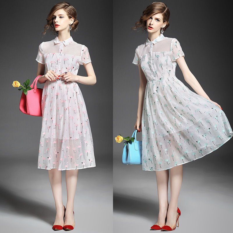 2015夏季女装 翻领气质淑女网纱拼接印花大摆a字裙修身显瘦