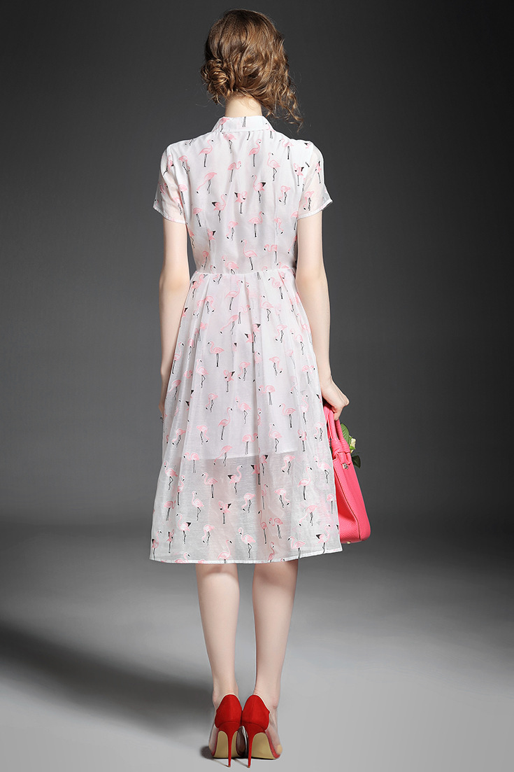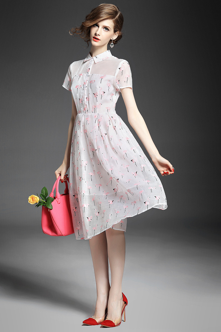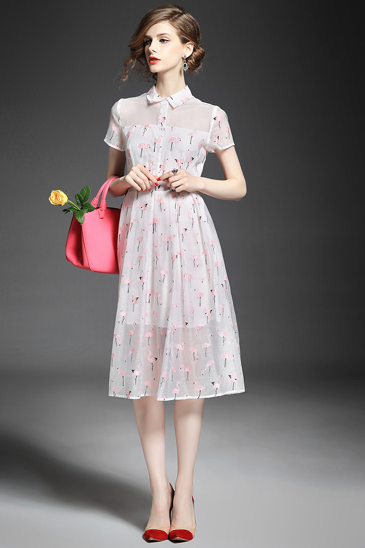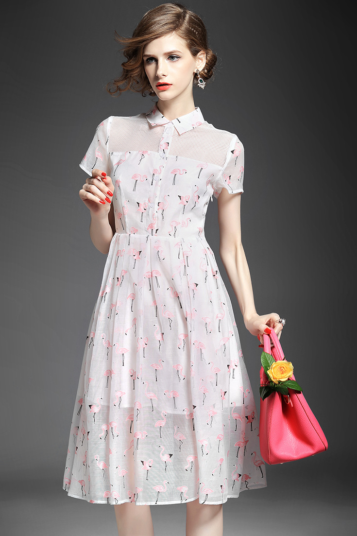 2015夏季女装 翻领气质淑女网纱拼接印花大摆a字裙修身显瘦