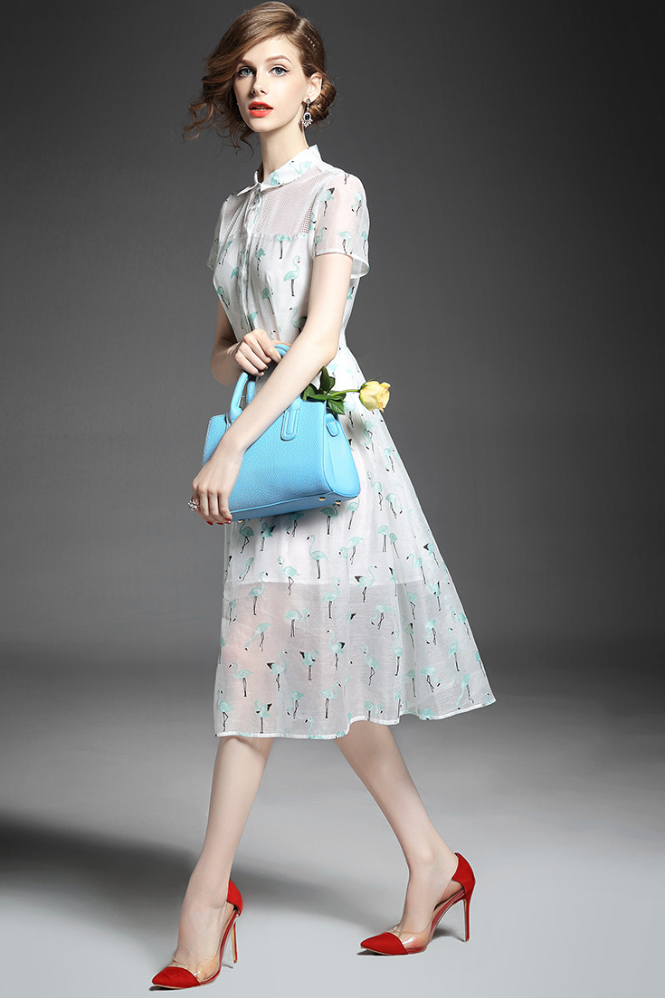 2015春夏季新款欧美风印花真丝连衣裙七分袖衬衣领时尚A字裙
