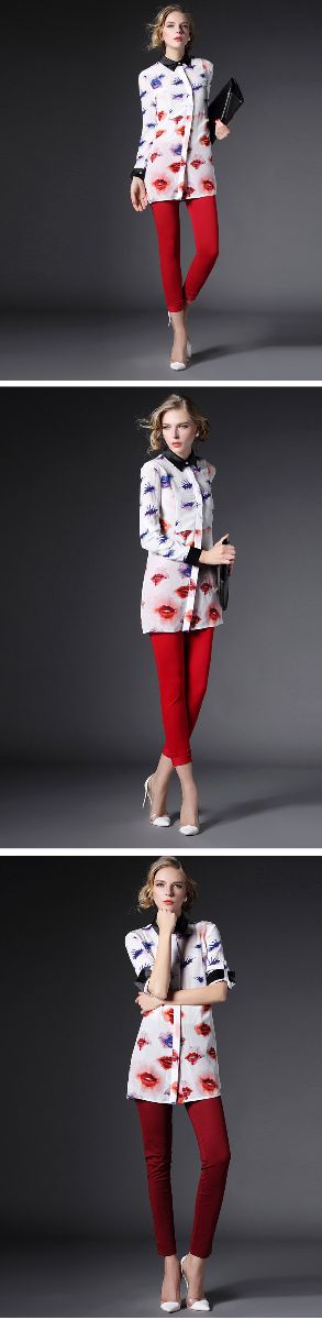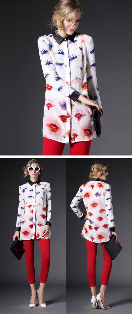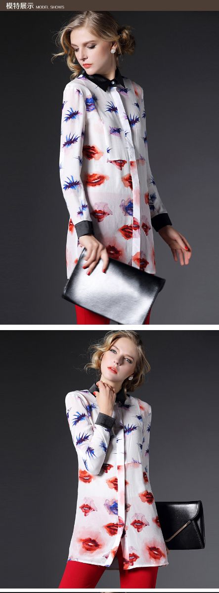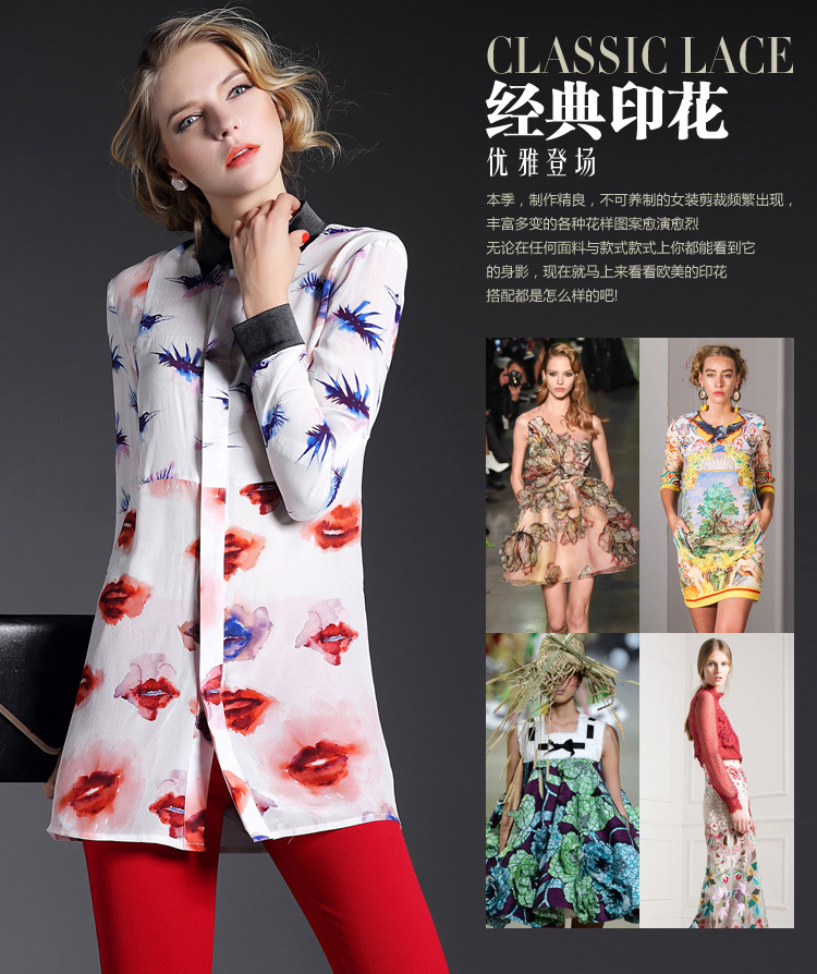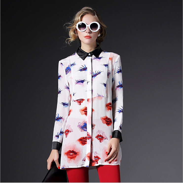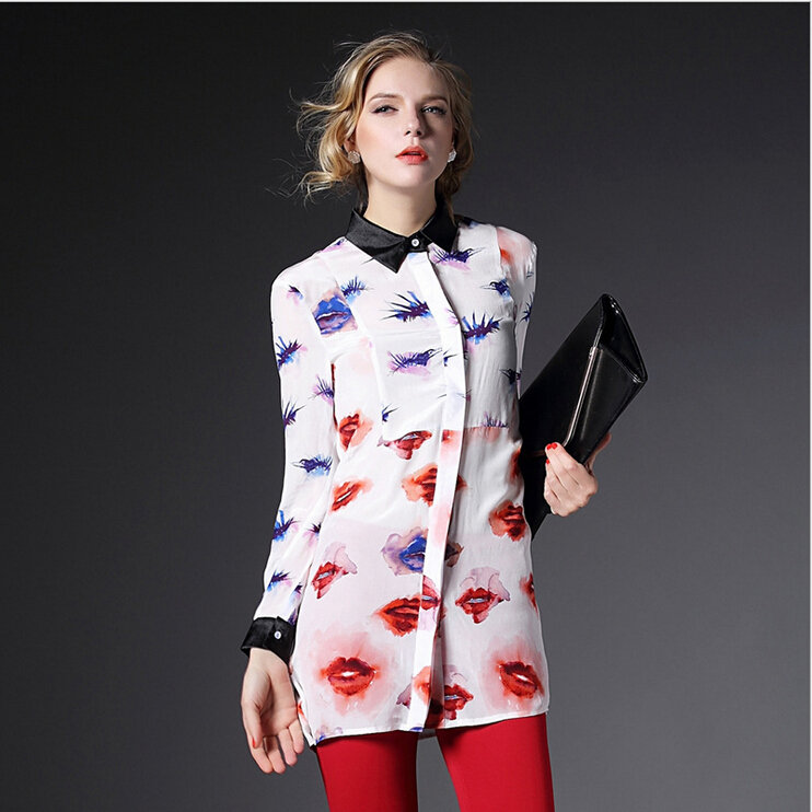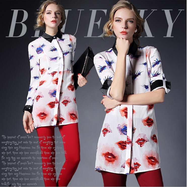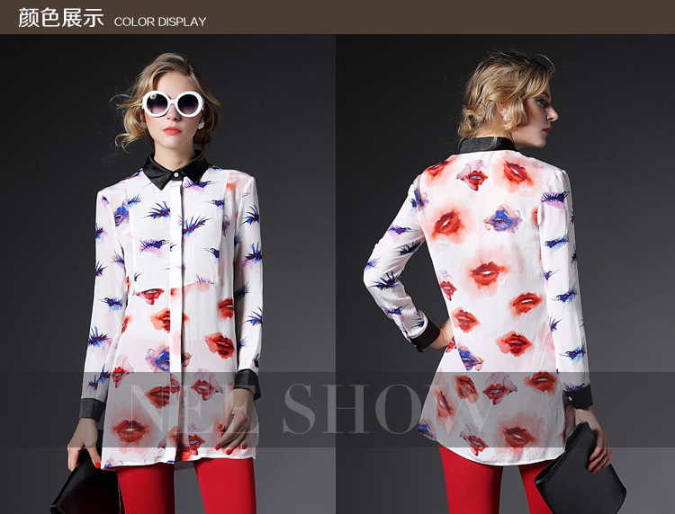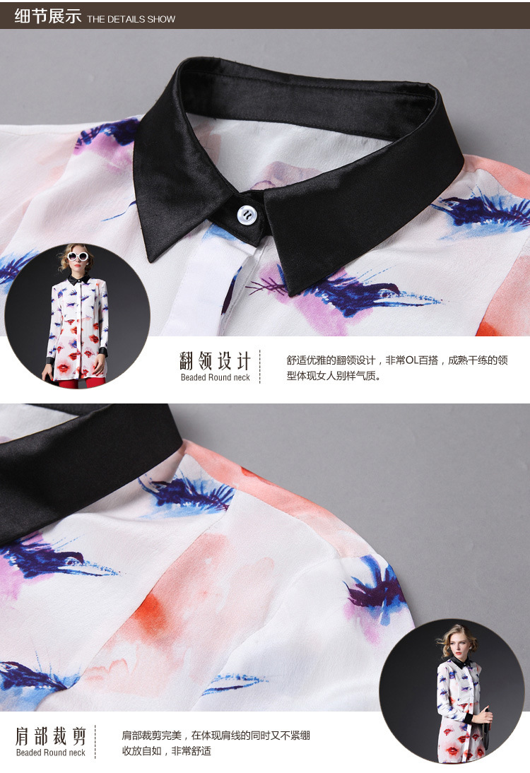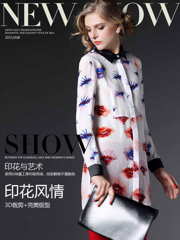 2015春装新款欧美风修身桃心印花真丝衬衣女式长袖衬衫