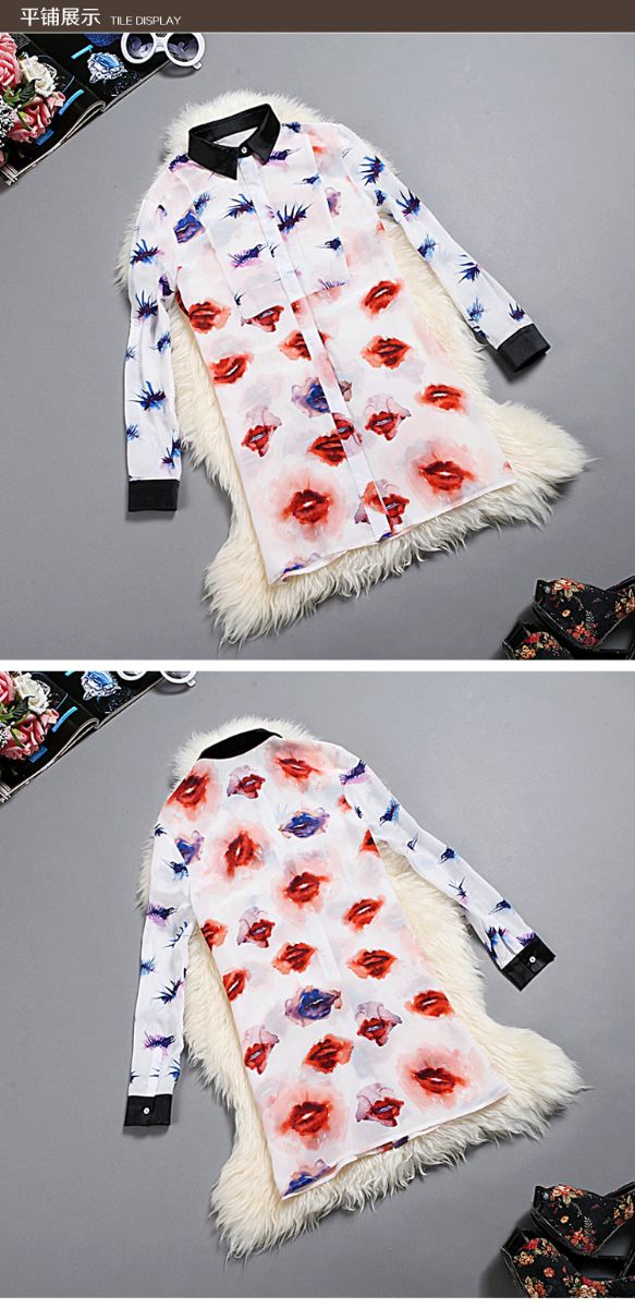 2015新款纯棉打底印花白衬衣女中长款宽松全棉长袖白色衬衫