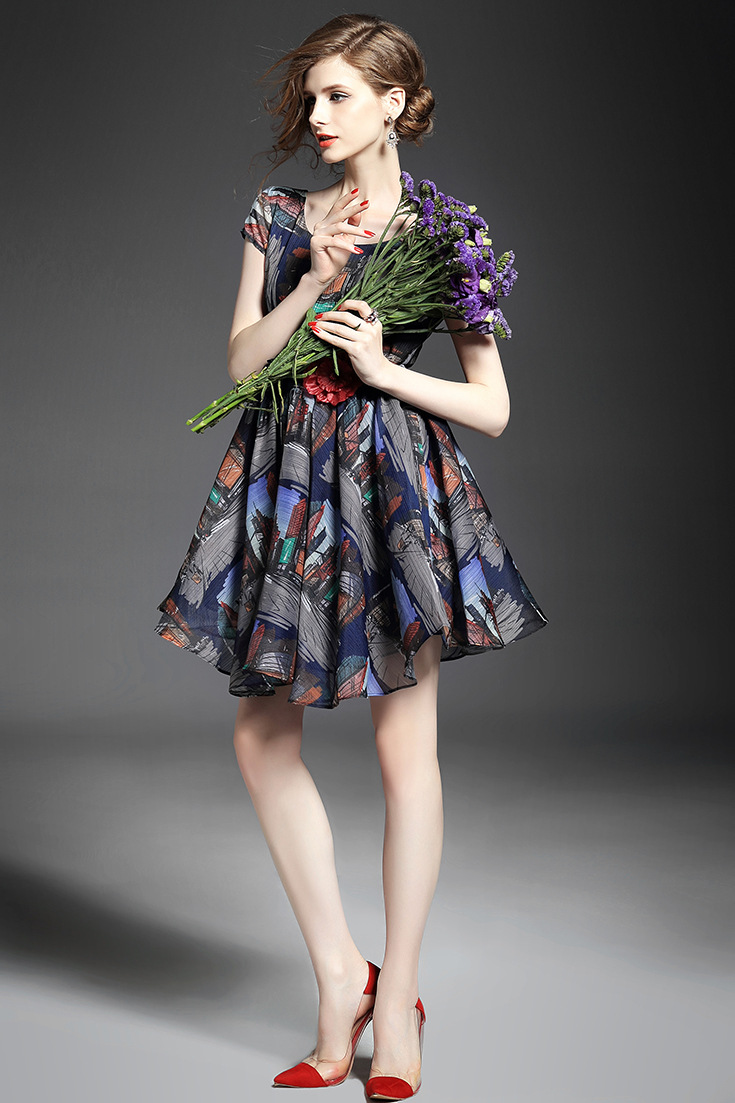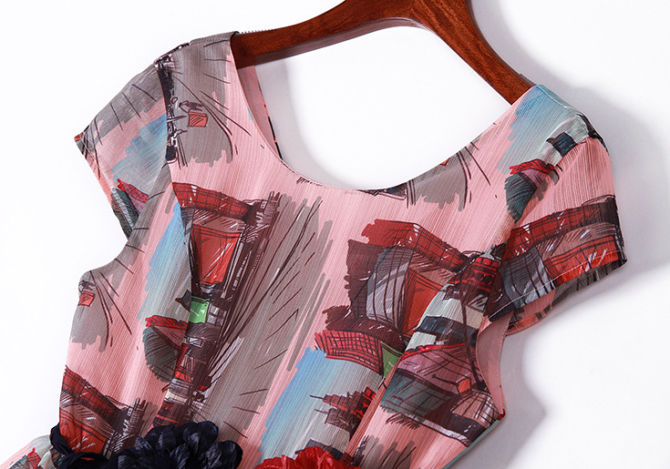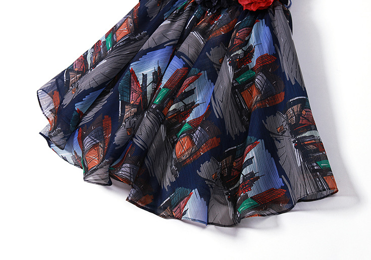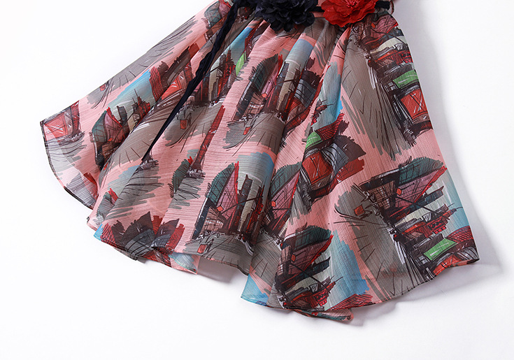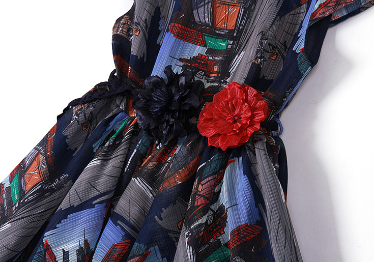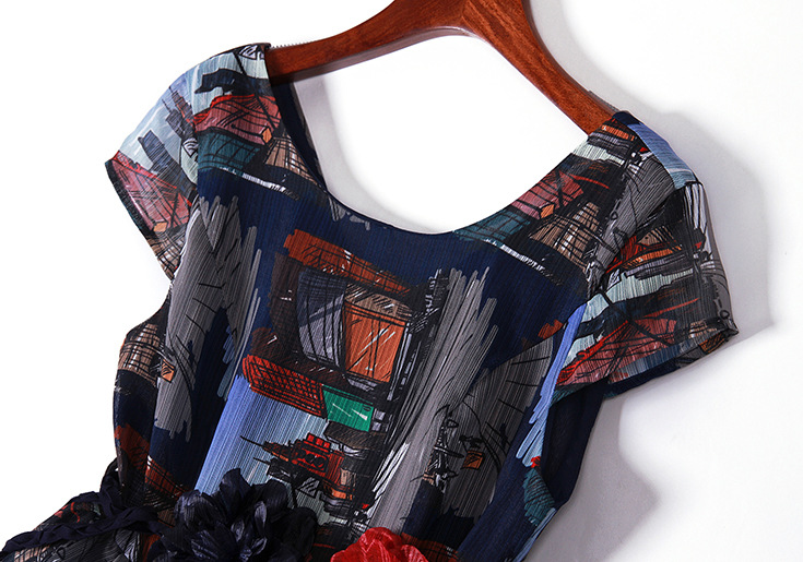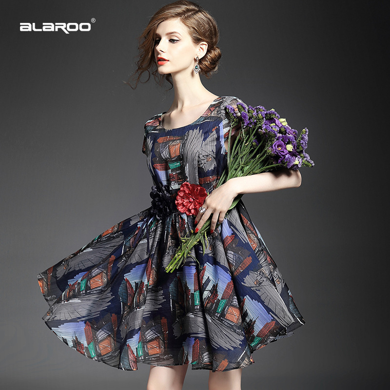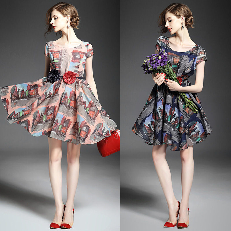 2015春夏新款欧美风印花高档桑蚕丝七分袖A字裙真丝连衣裙