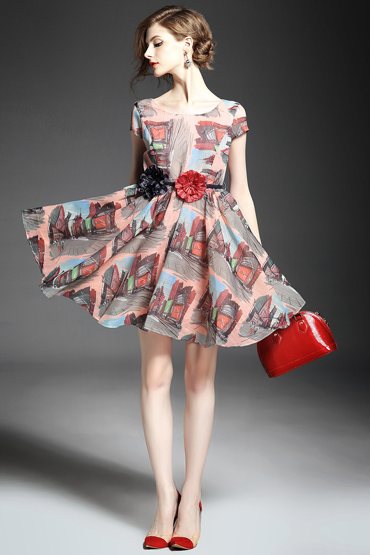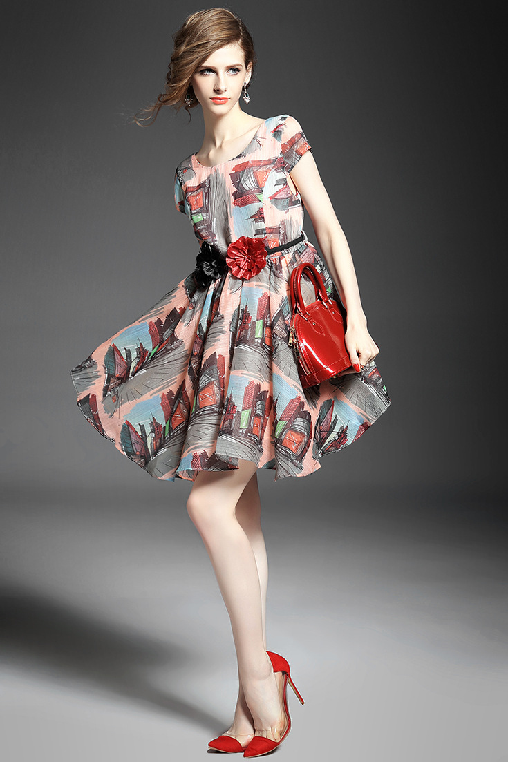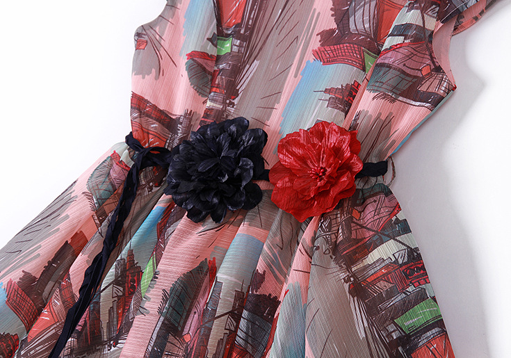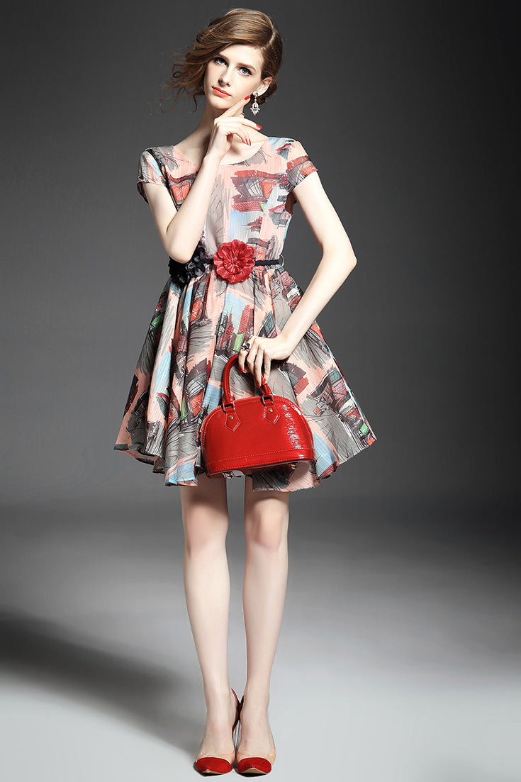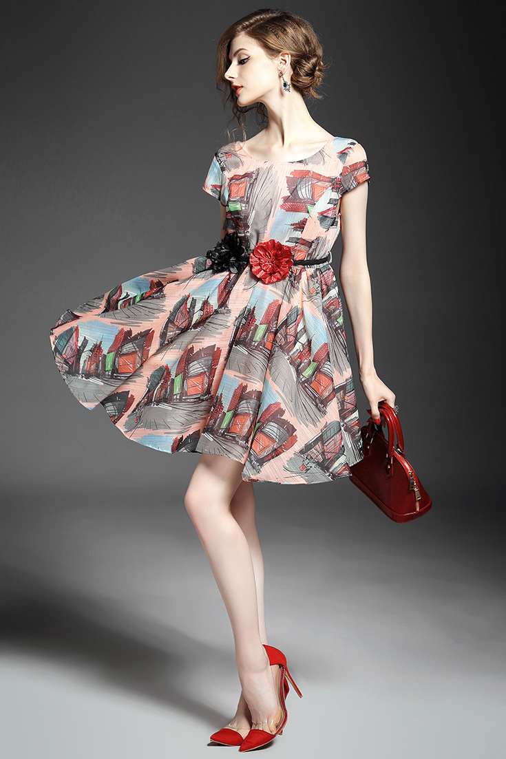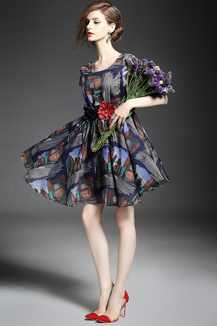 2015春夏新款欧美风印花高档桑蚕丝七分袖A字裙真丝连衣裙
