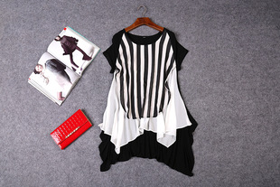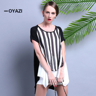 > 2015夏装 时尚女装 欧美大牌气质优雅宽松条纹雪纺连衣裙