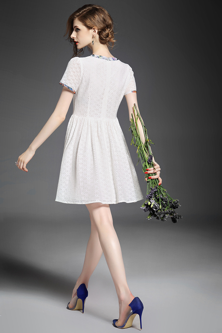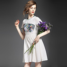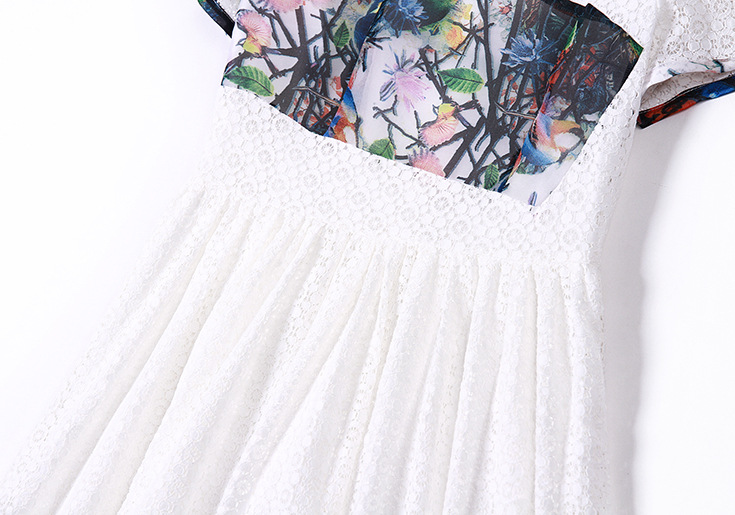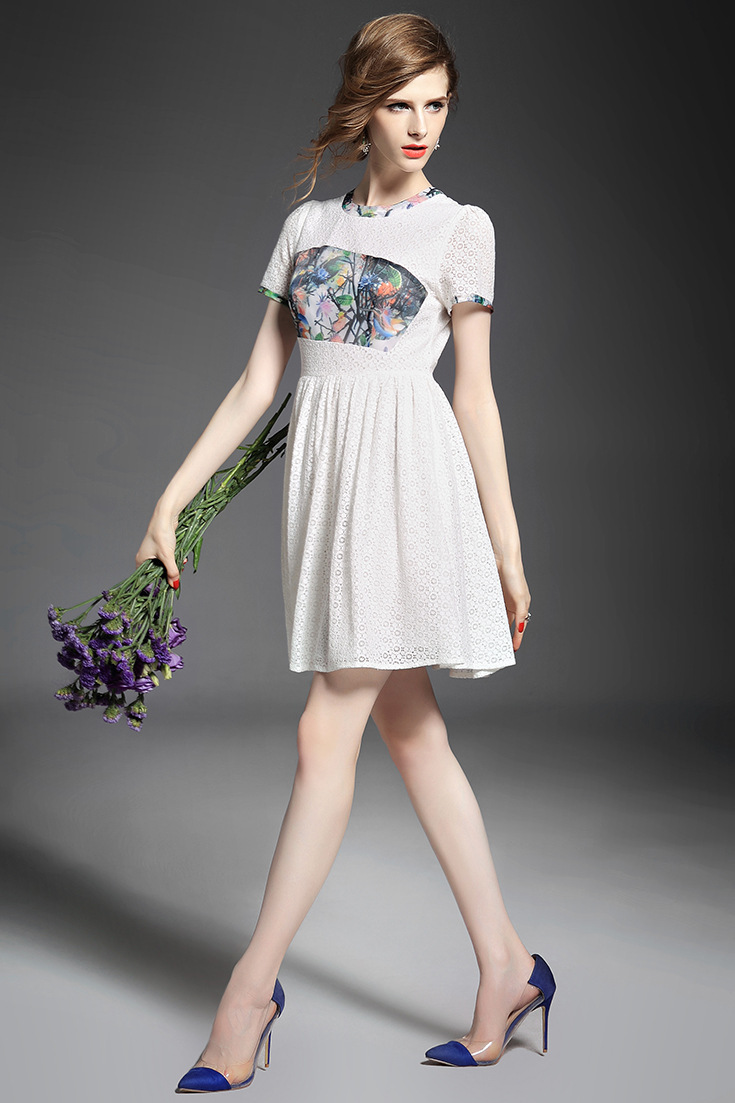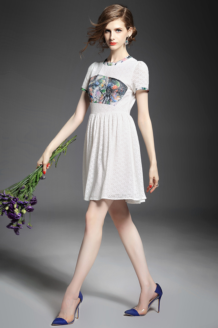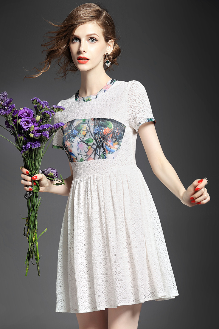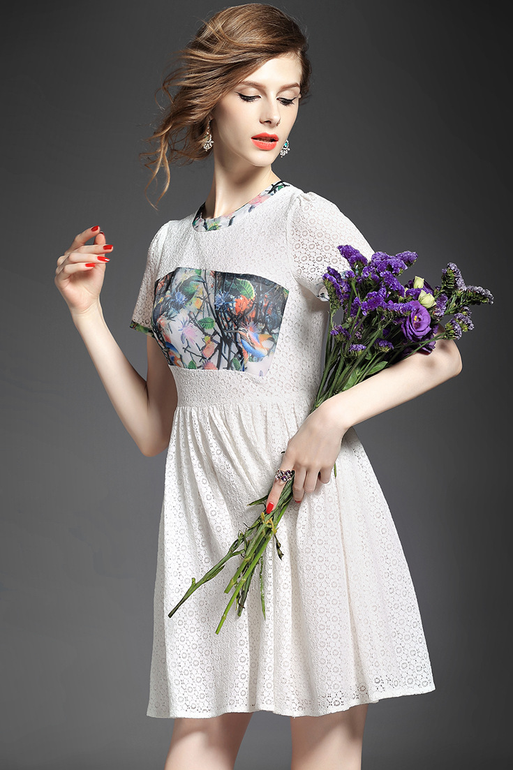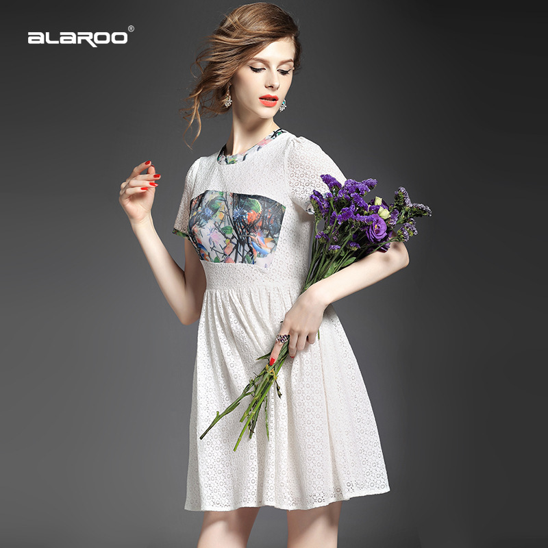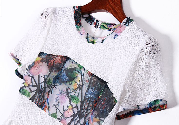 > 2015夏季女装新款 欧美圆领短袖印花拼接修身蕾丝连衣裙子