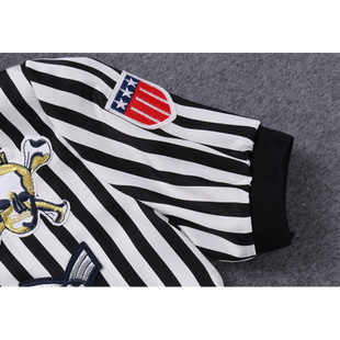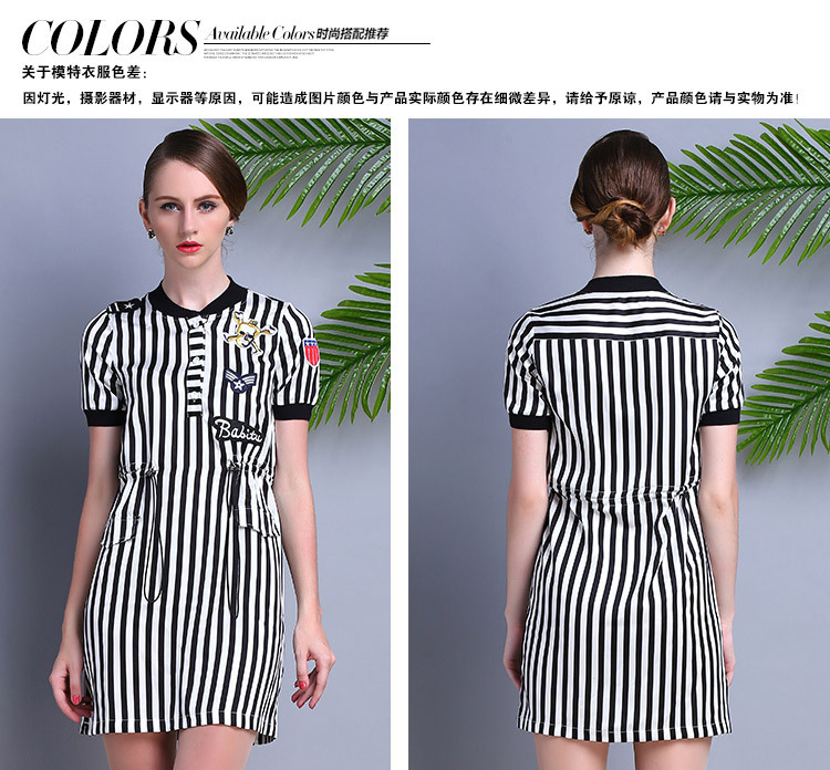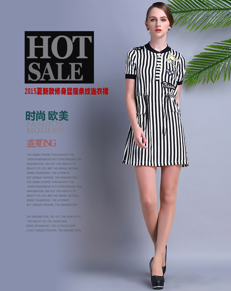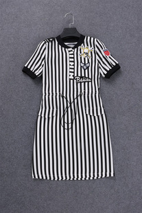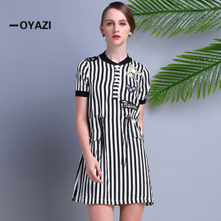2015夏装新款 欧美女装时尚气质刺绣黑白条纹连衣裙