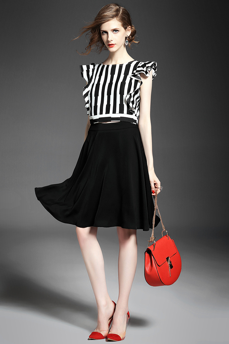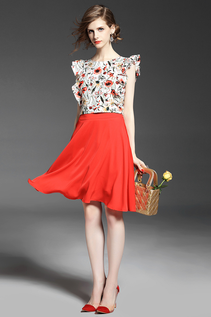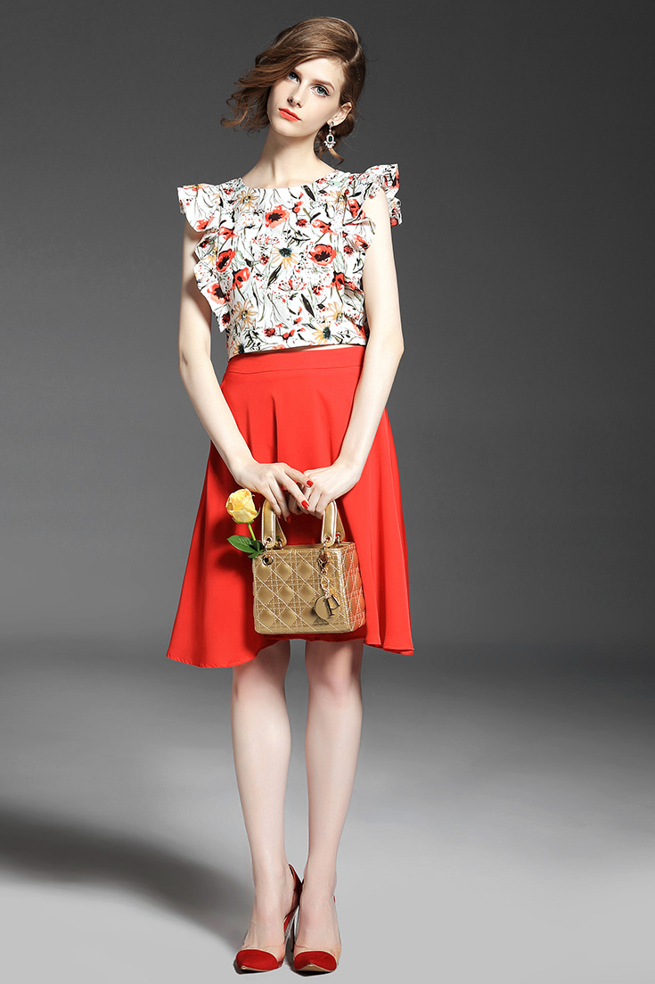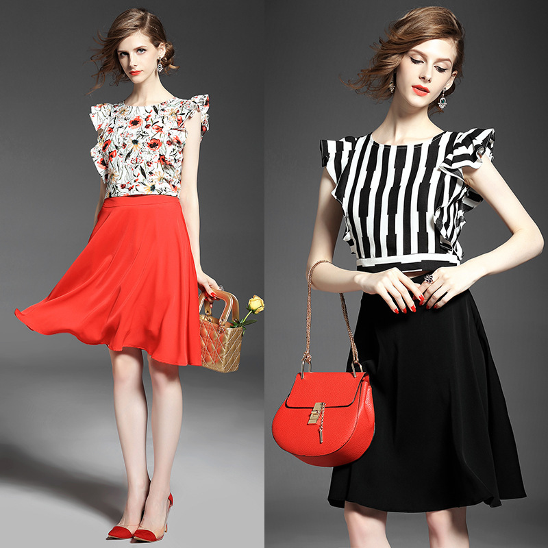 2015淑女气质圆领印花荷叶袖蝴蝶结短上衣+纯色修身半裙两件套夏