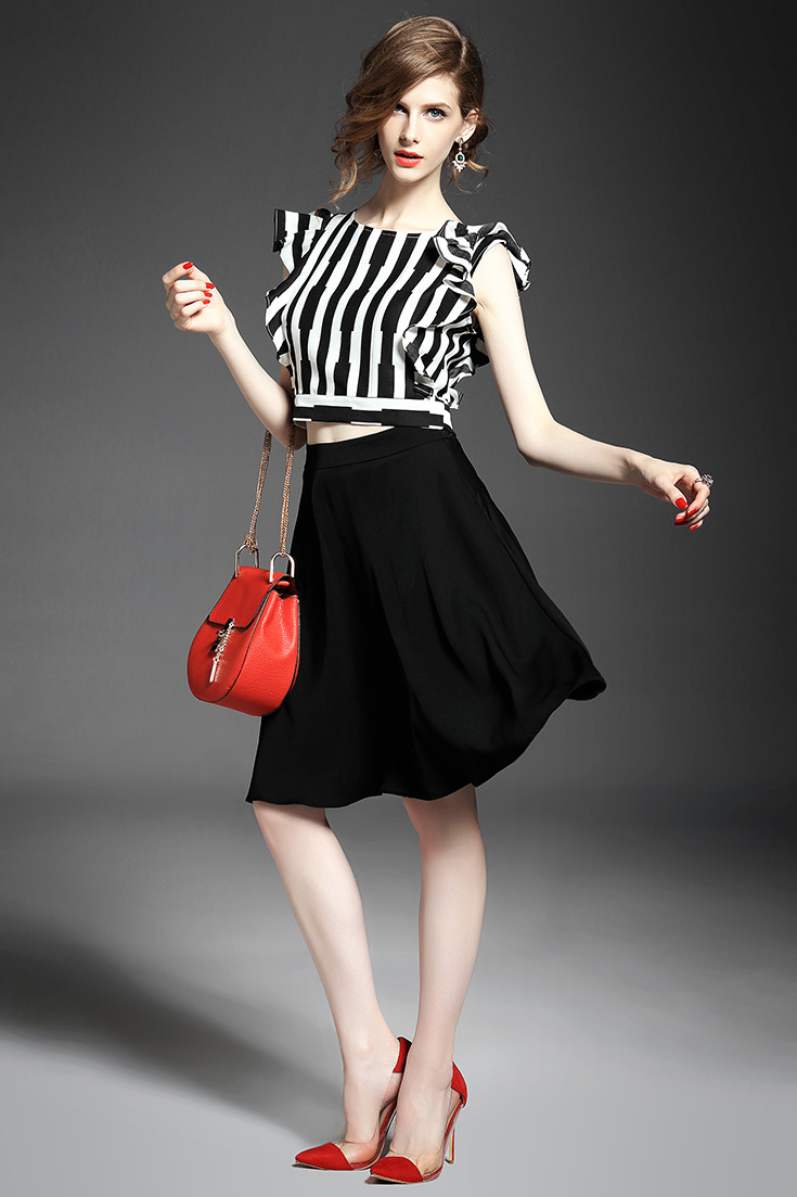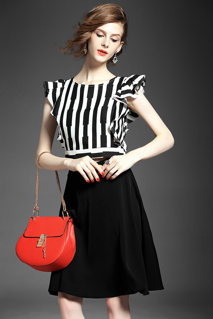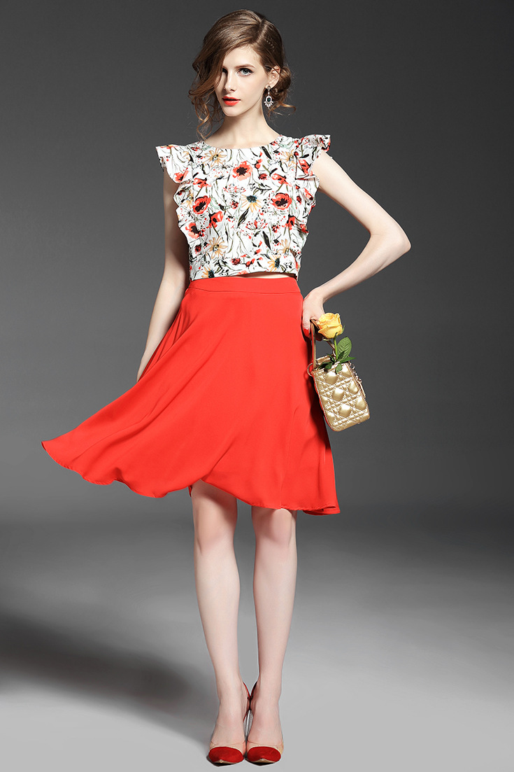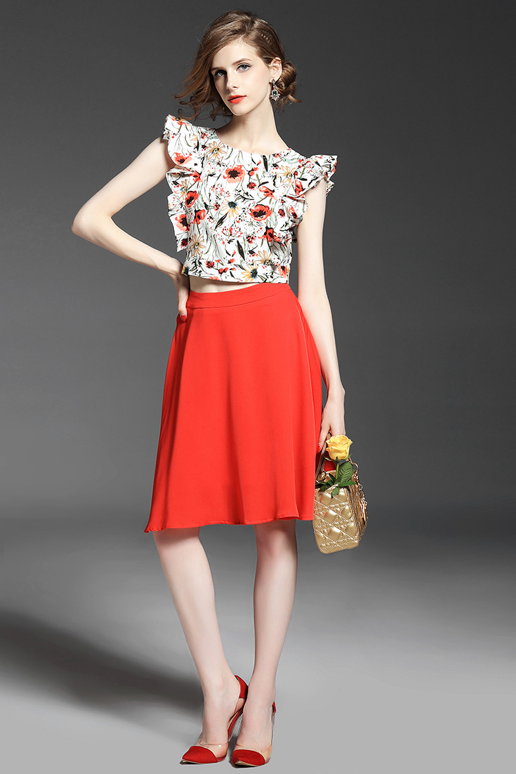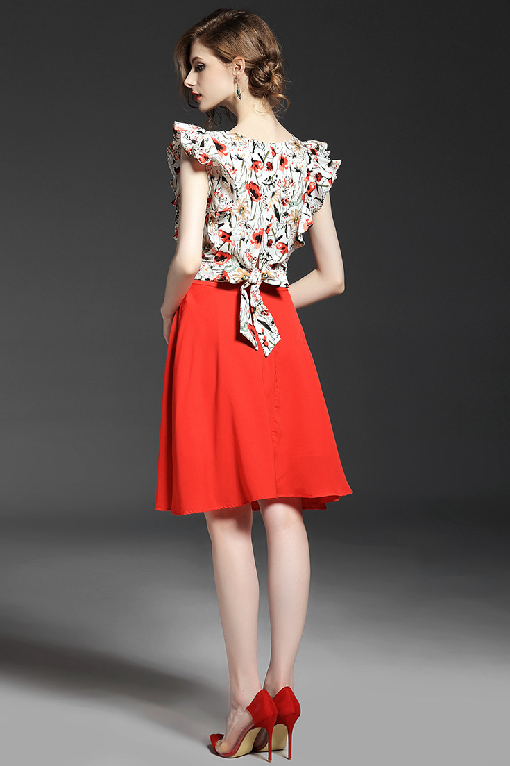> 2015淑女气质圆领印花荷叶袖蝴蝶结短上衣+纯色修身半裙两件套夏