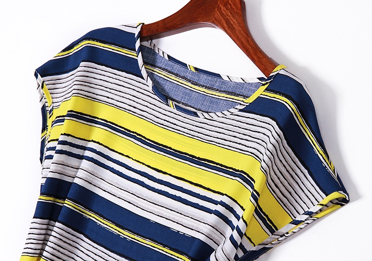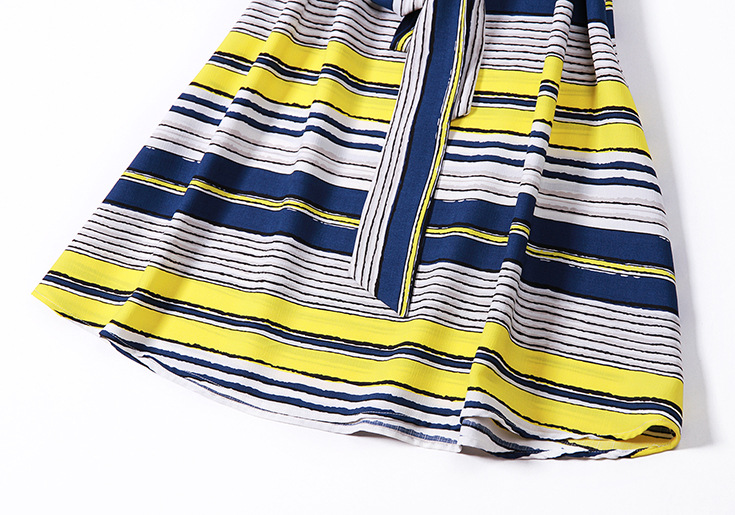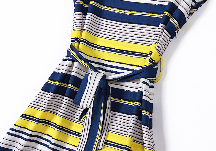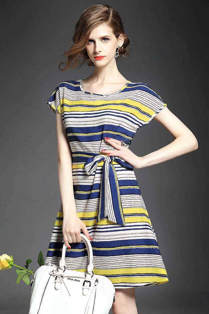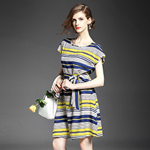 > 2015夏季新款 圆领撞色横条纹系带修身气质连衣裙显瘦