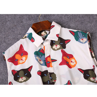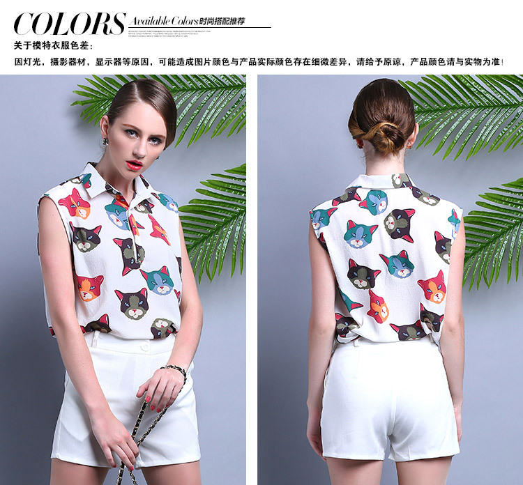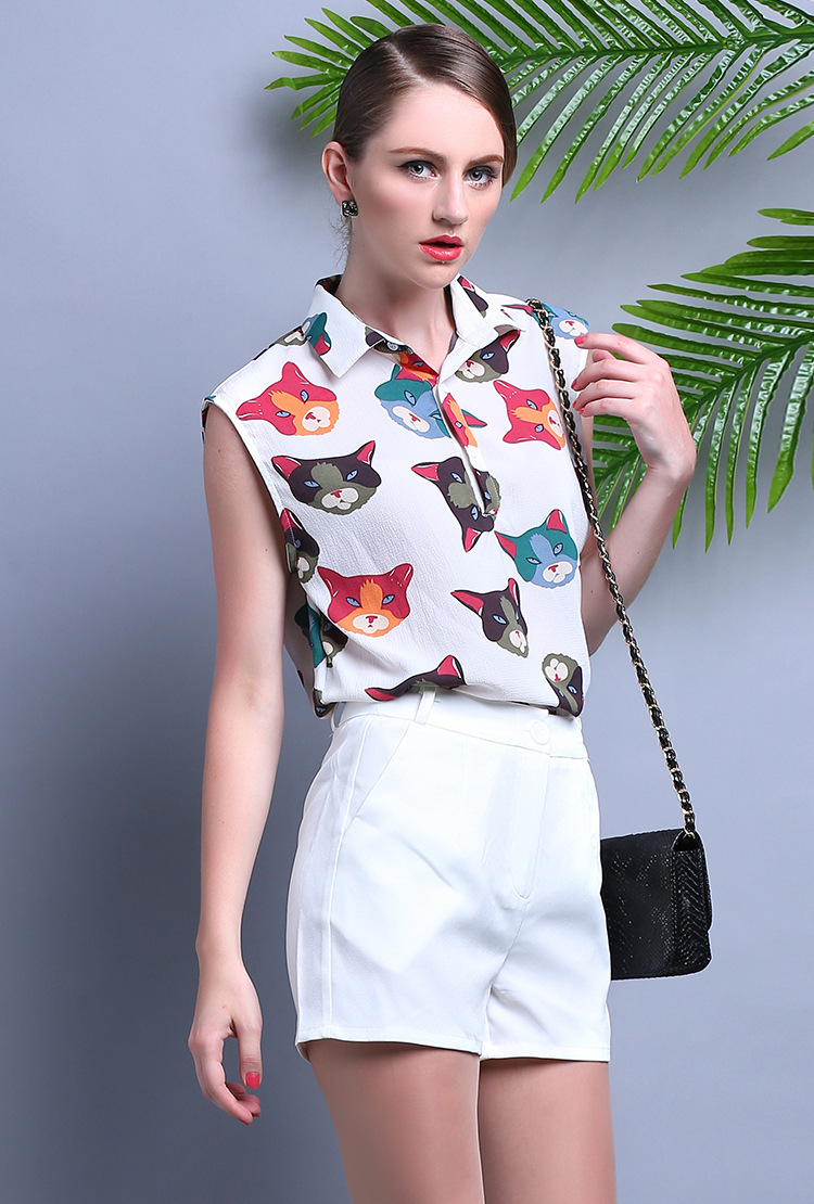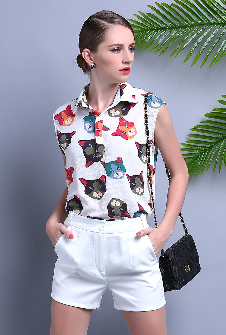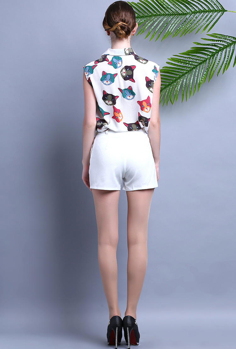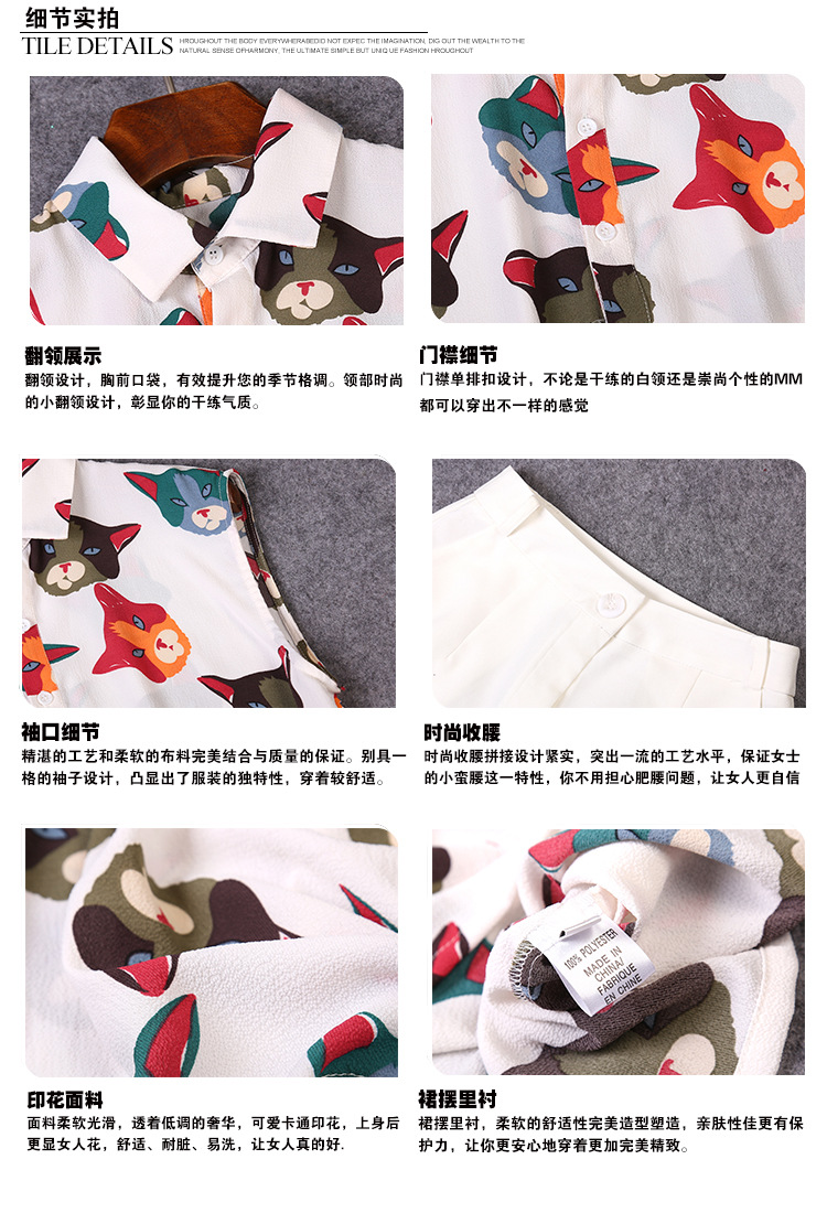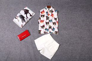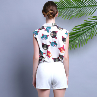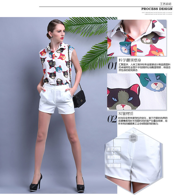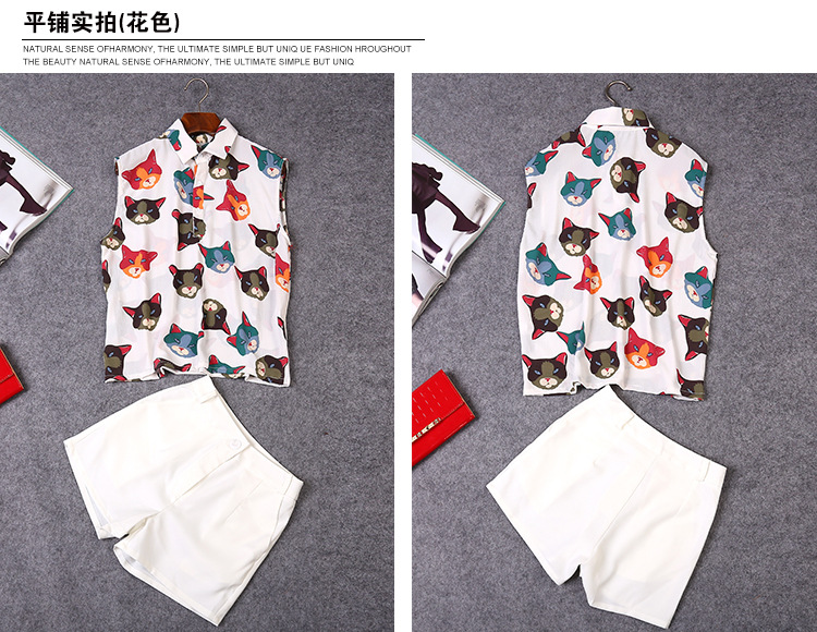 2015夏装 时尚女装 欧美大牌卡通猫衬衣+时尚短裤套装