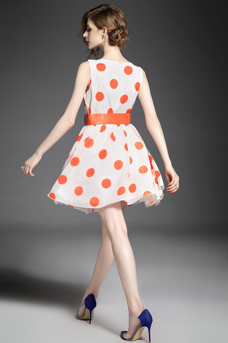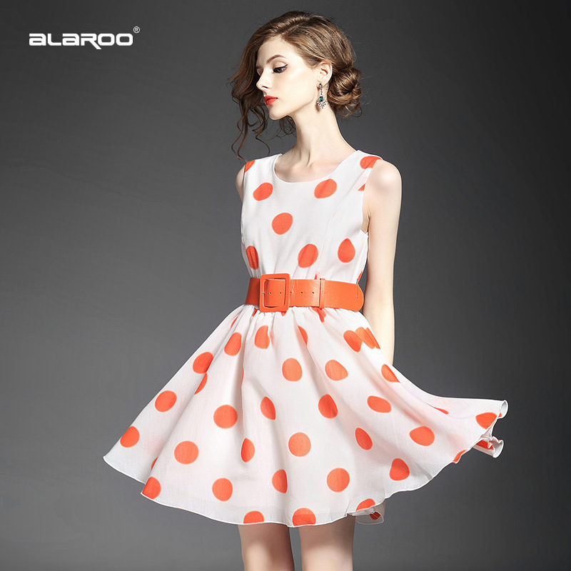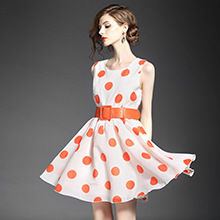 2015品牌女装夏 圆领泡泡纱甜美大波点印花收腰修身a字裙送腰带