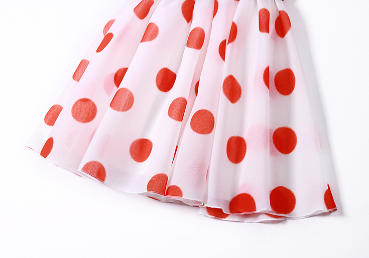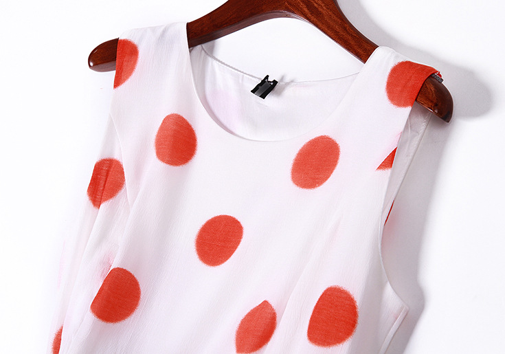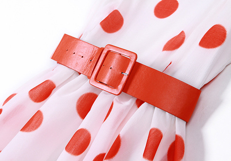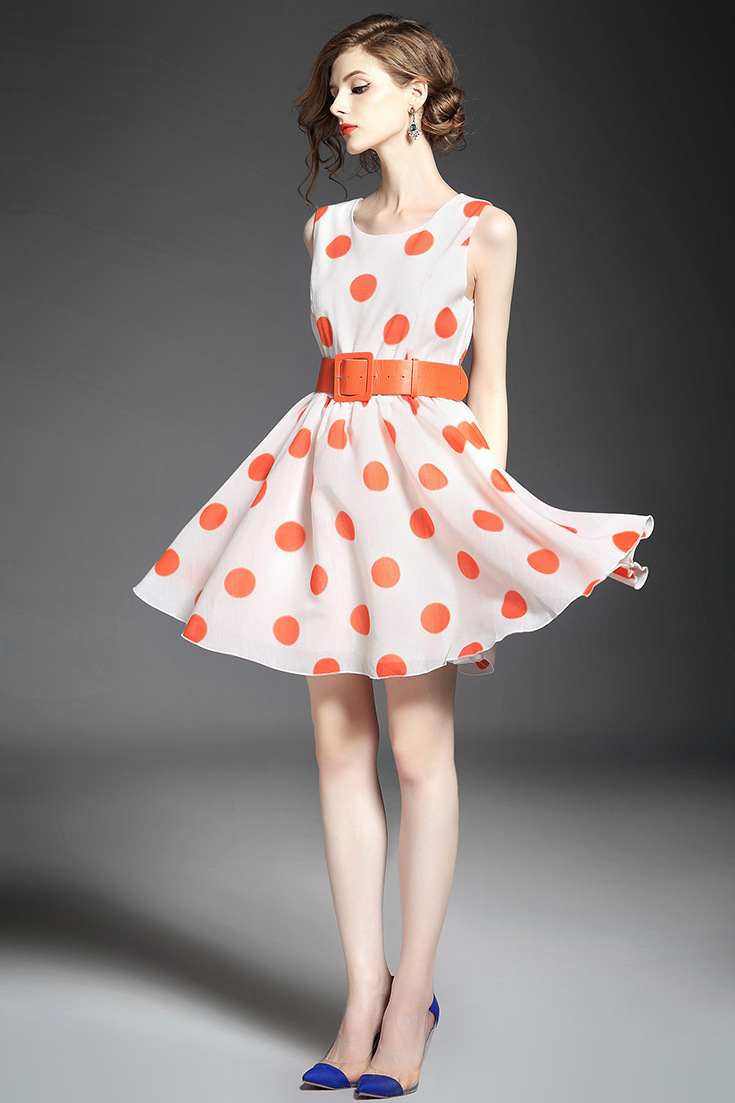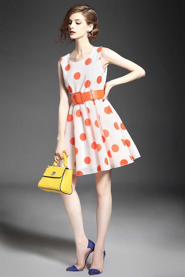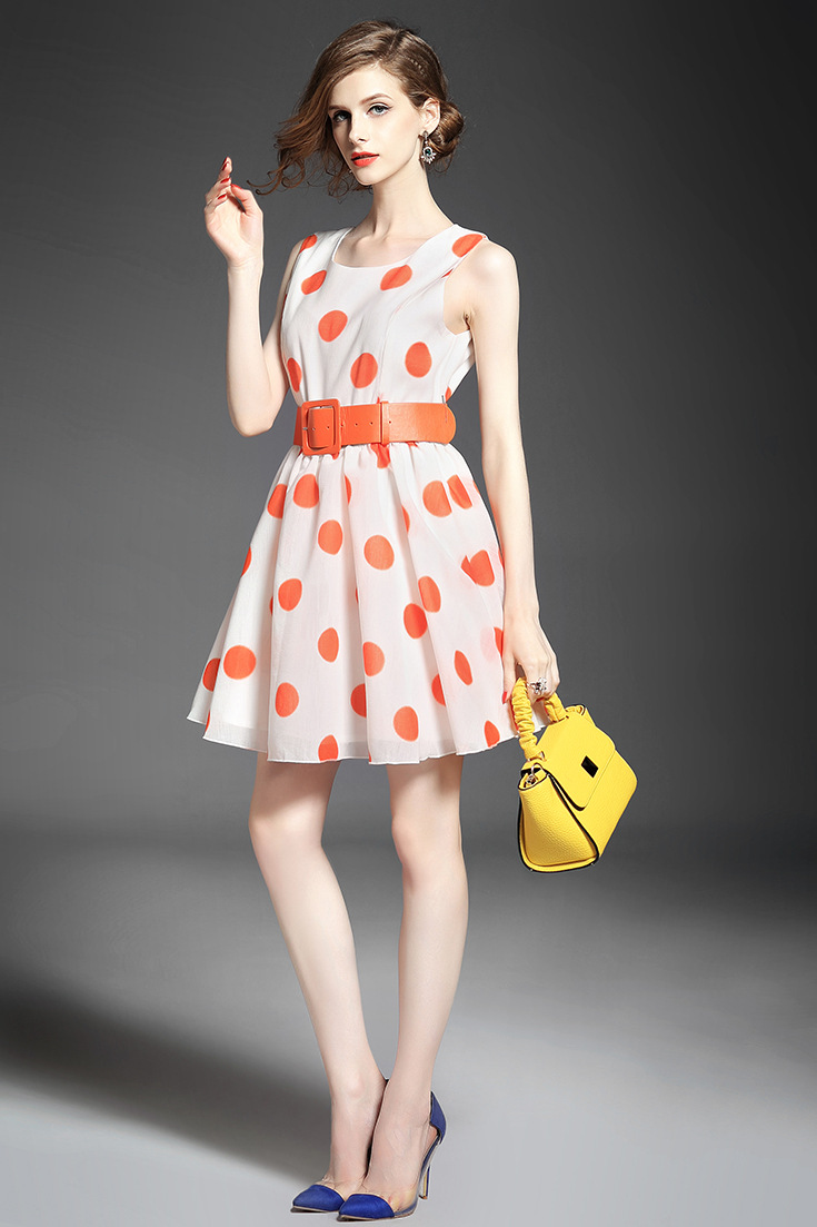 > 2015品牌女装夏 圆领泡泡纱甜美大波点印花收腰修身a字裙送腰带