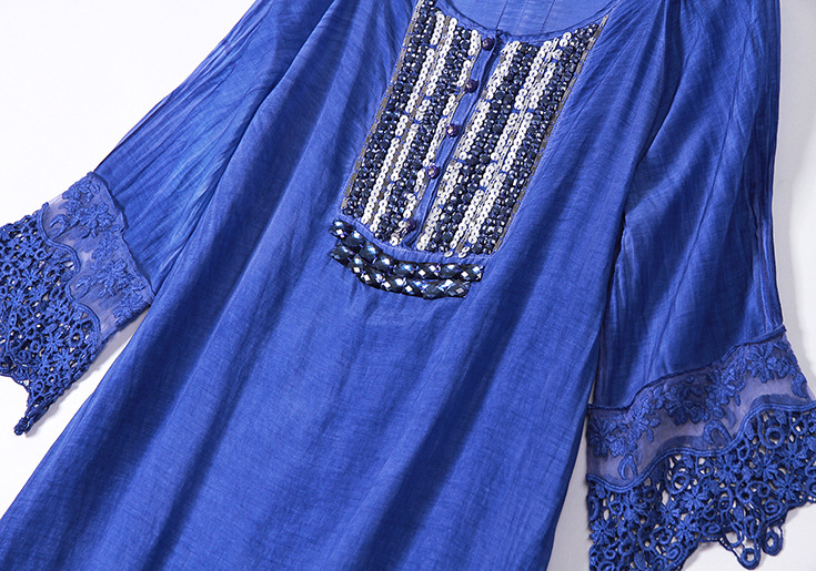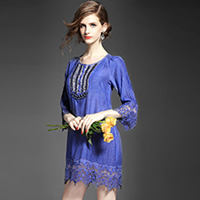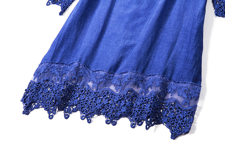 > 2015夏季女装 欧美高端亮片水溶绣花拼接气质波浪边纯色连衣裙
