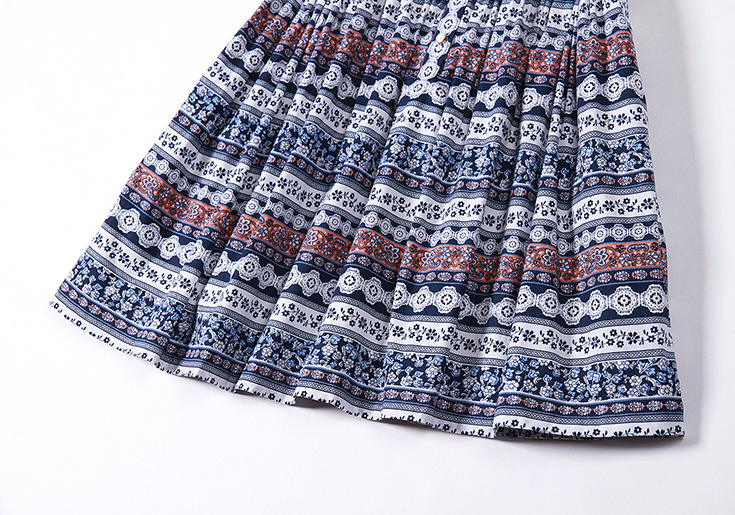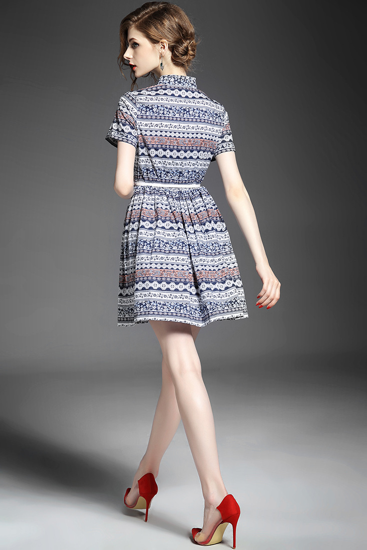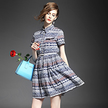 > 2015夏季女装新款 欧美大牌翻领青花瓷印花收腰修身a字裙送腰带