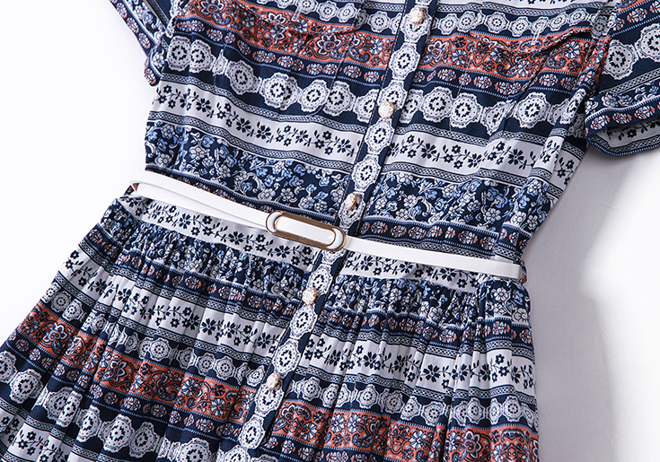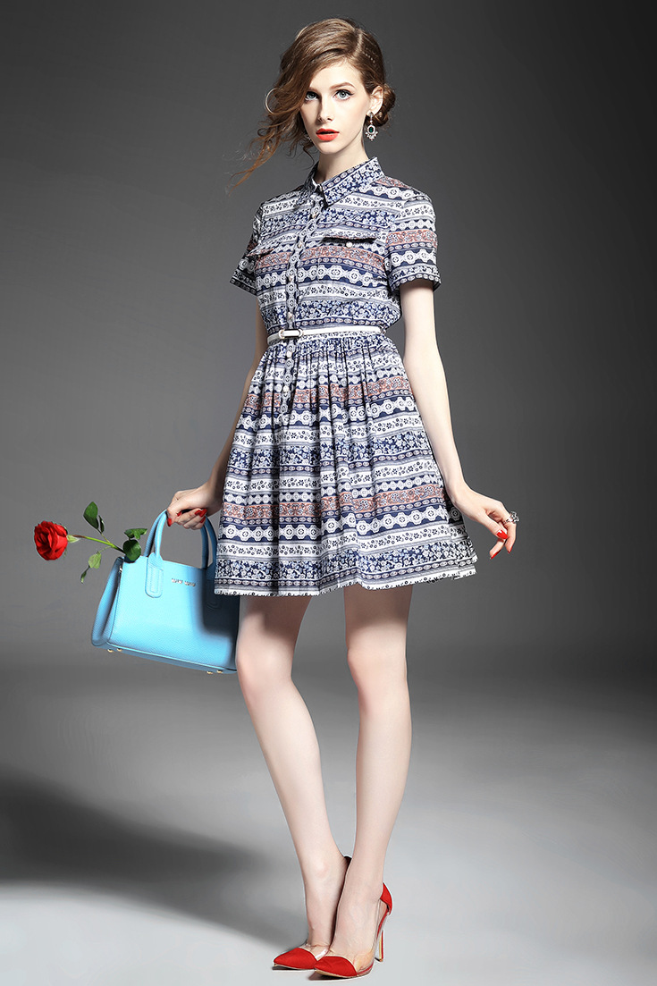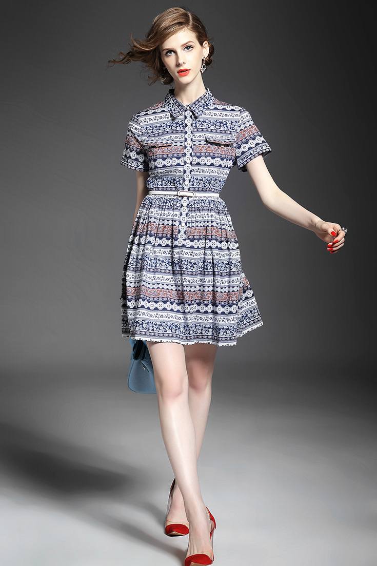 2015夏季女装新款 欧美大牌翻领青花瓷印花收腰修身a字裙送腰带
