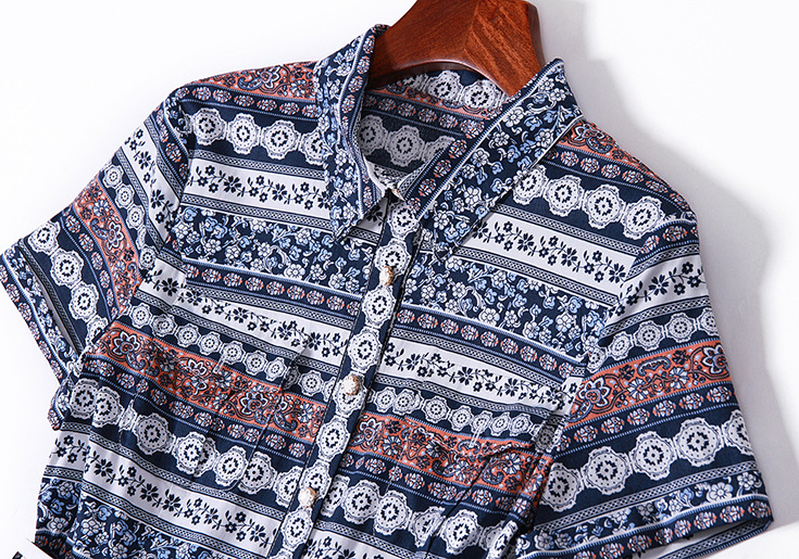 2015春夏季新款欧美风印花真丝连衣裙七分袖衬衣领时尚A字裙