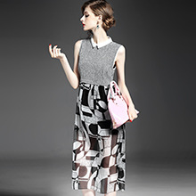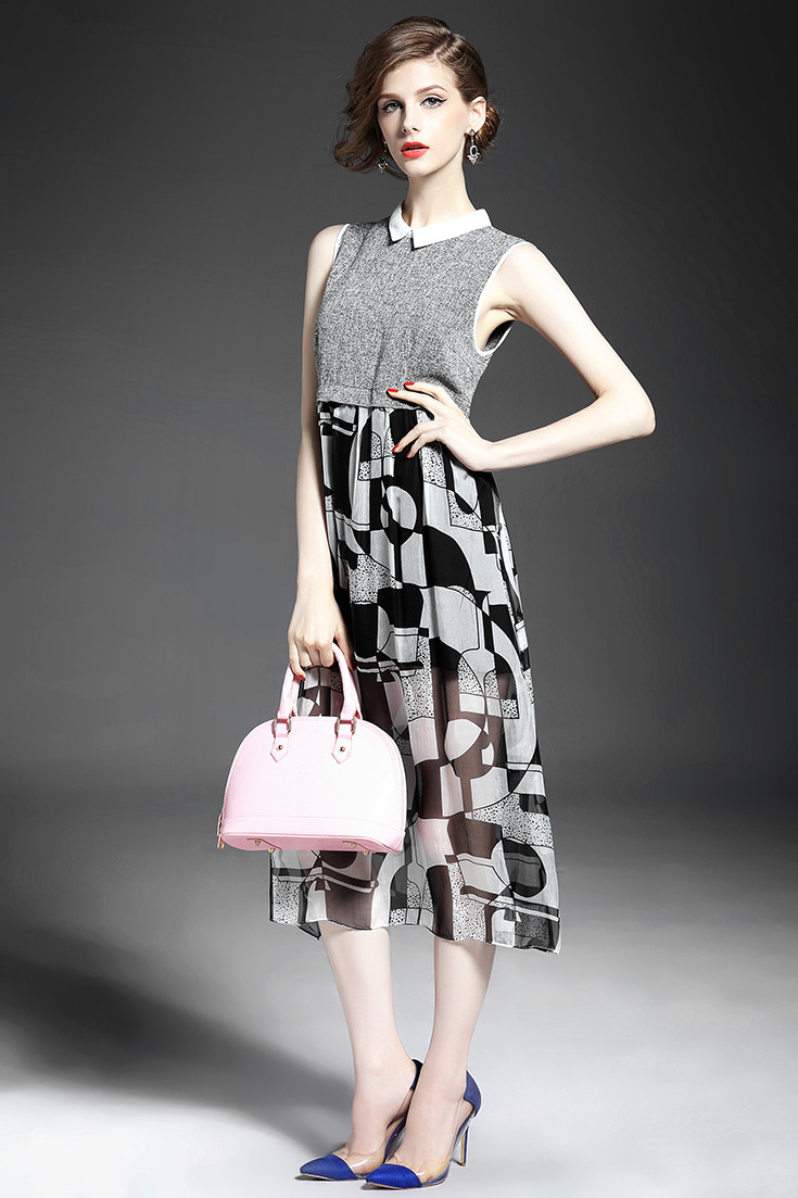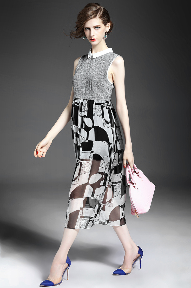 2015欧美夏季新款女装 翻领无袖真丝印花拼接修身大摆中长连衣裙