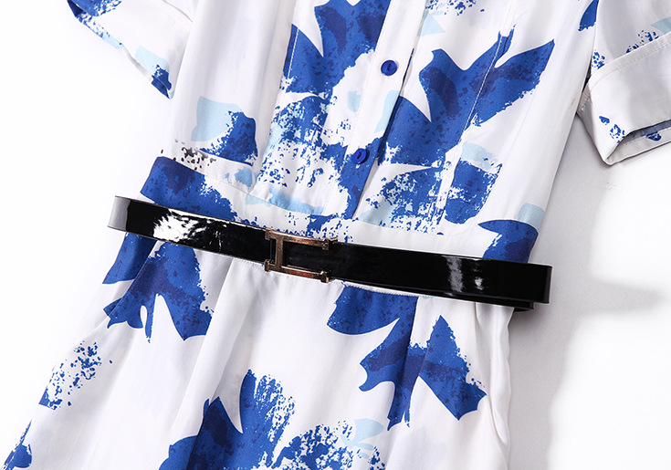 2015春夏季新款欧美风印花真丝连衣裙七分袖衬衣领时尚A字裙