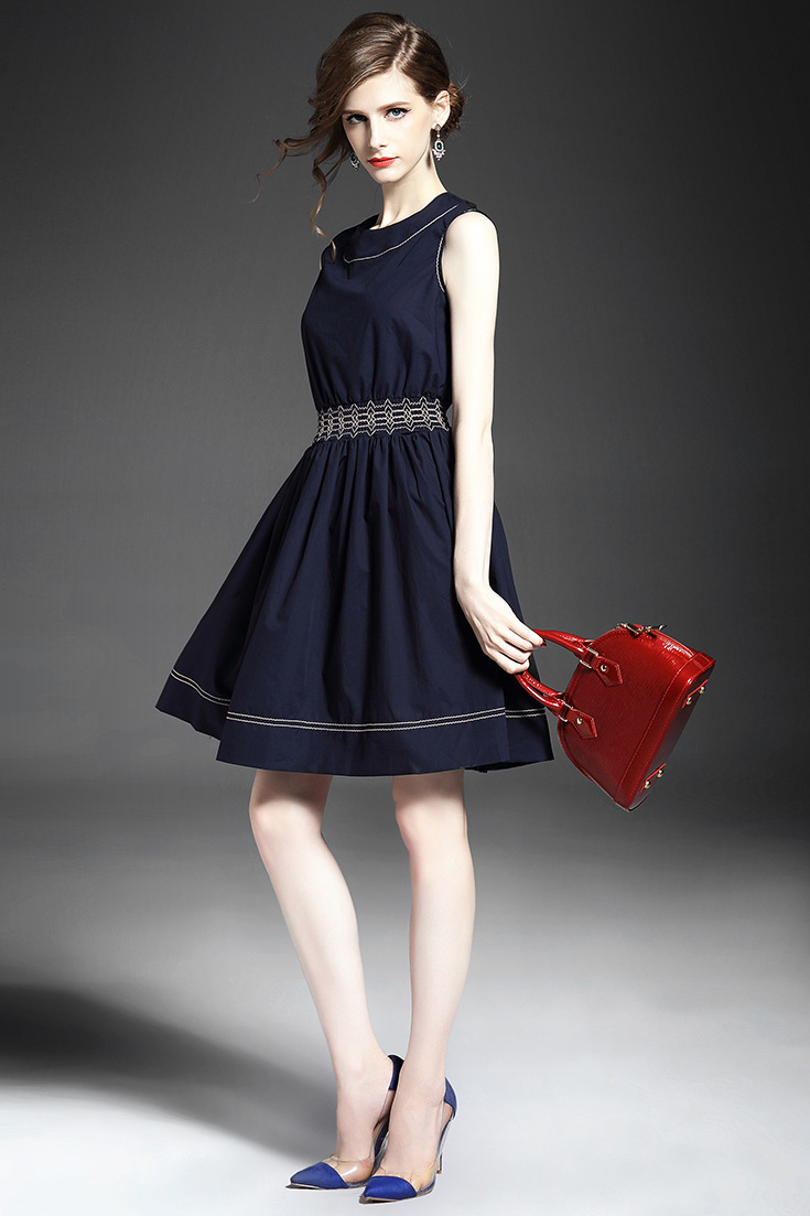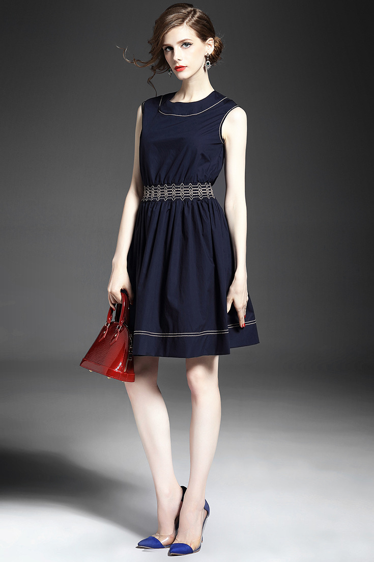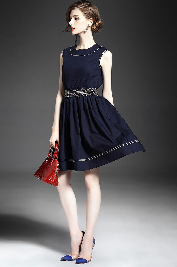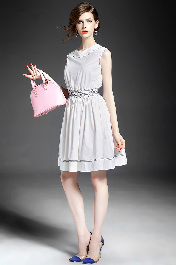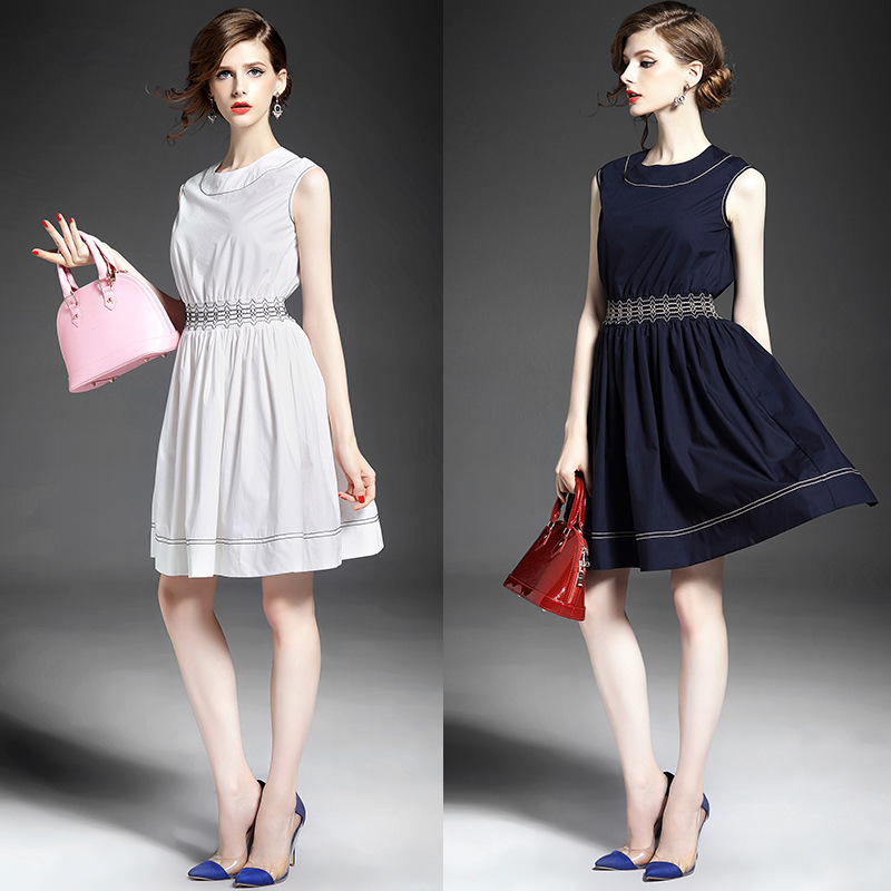> 2015夏季女装 欧美时尚圆领无袖腰节弹力压褶修身a字裙