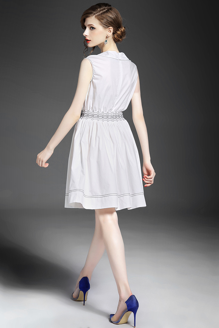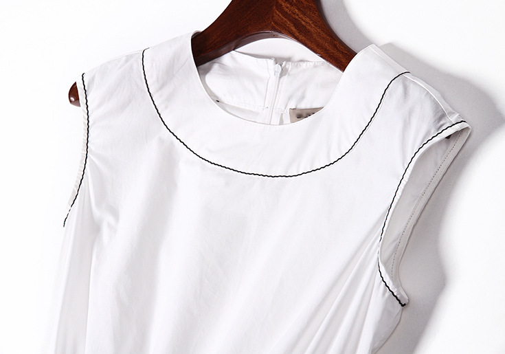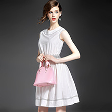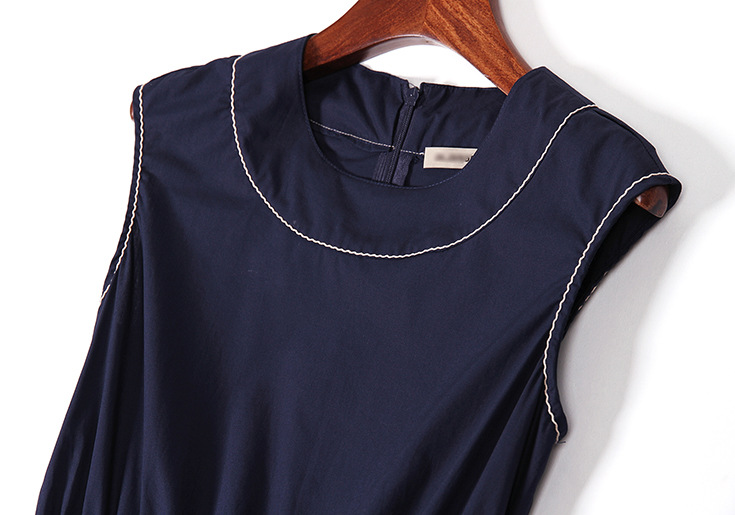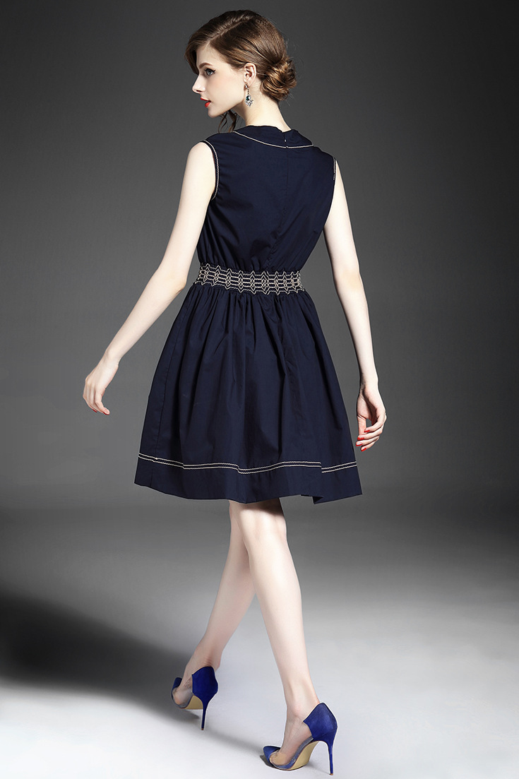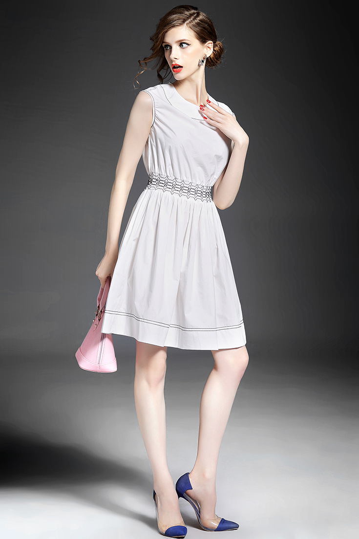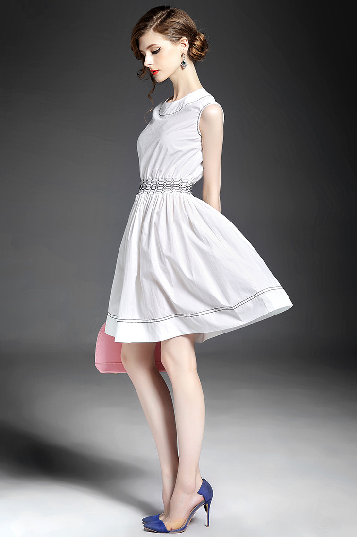 > 2015夏季女装 欧美时尚圆领无袖腰节弹力压褶修身a字裙