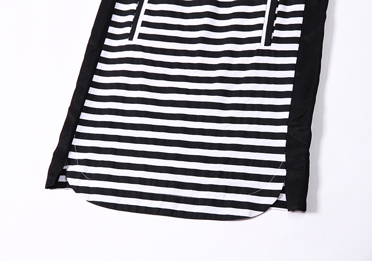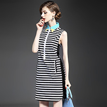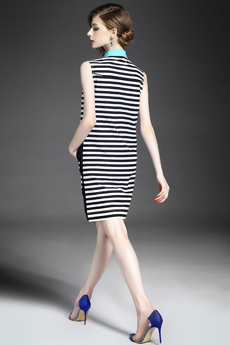 > 2015夏装新款 欧美时尚撞色翻领单排扣黑白条纹修身显瘦一步裙
