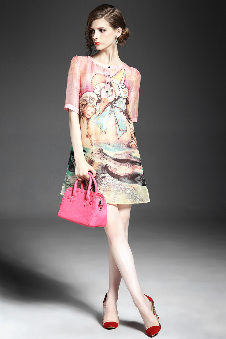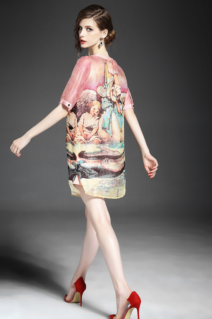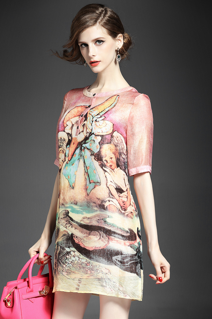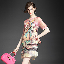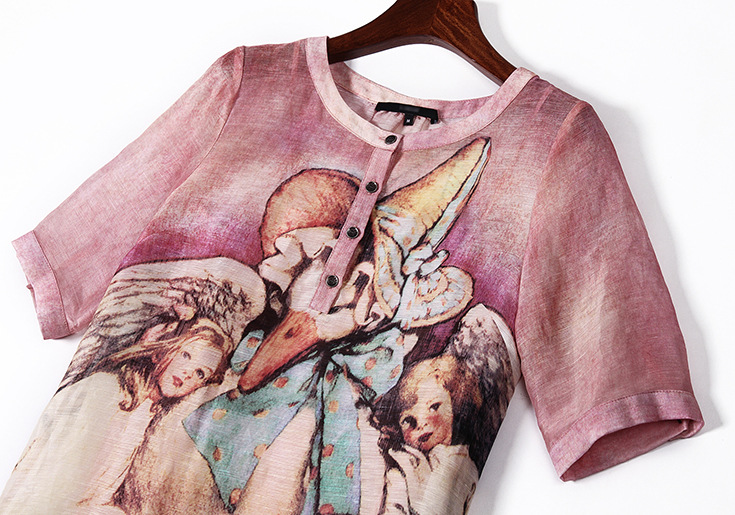 > 2015欧美高端女装夏季新款 圆领单排扣天使印花真丝麻修身一步裙