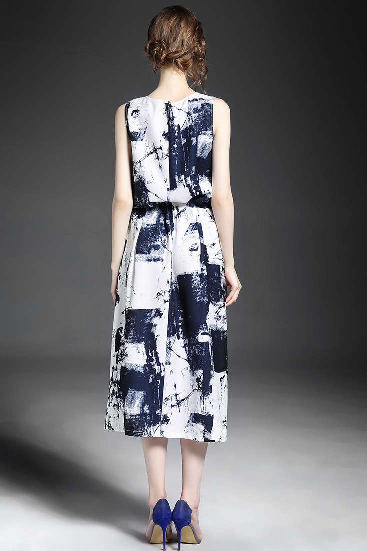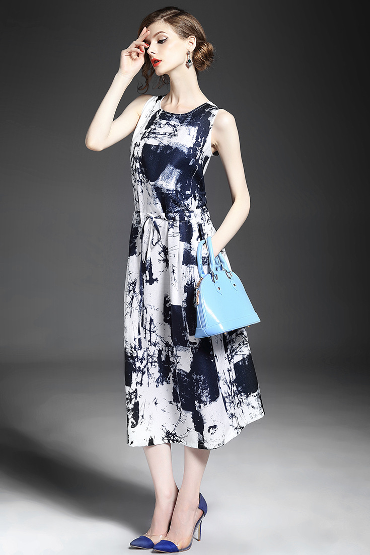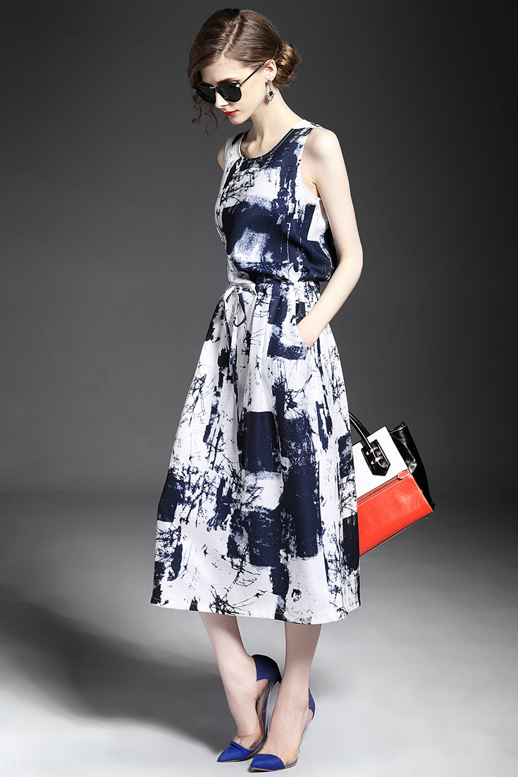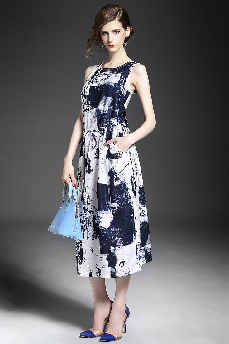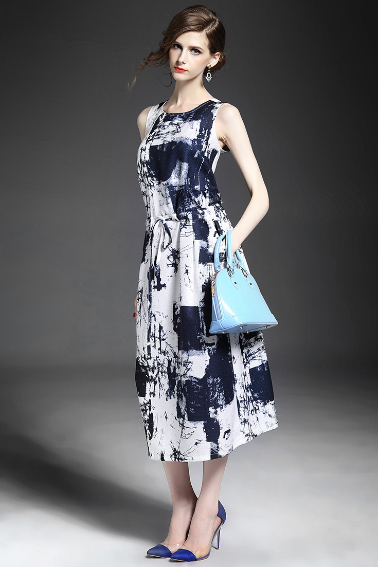 2015夏季新款 圆领无袖水墨印花抽绳系带收腰修身长裙