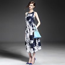 > 2015夏季新款 圆领无袖水墨印花抽绳系带收腰修身长裙