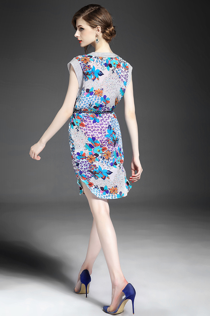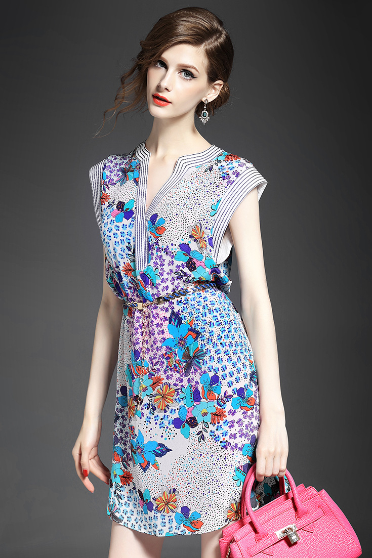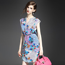 > 2015夏 欧洲站高端女装真丝印花不规则收腰修身包臀一步裙送腰链