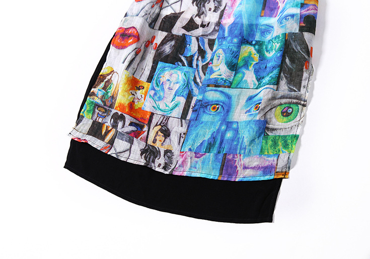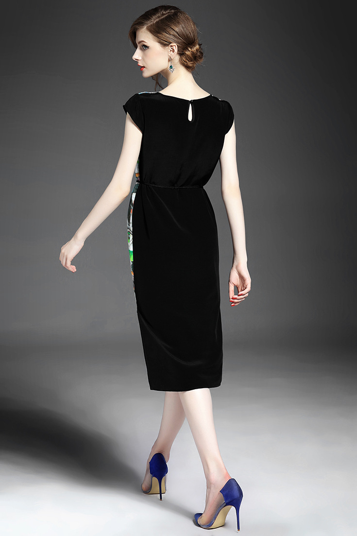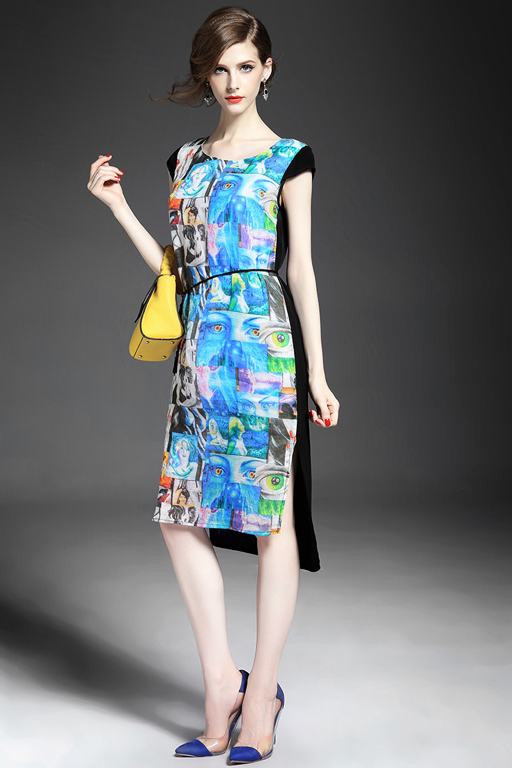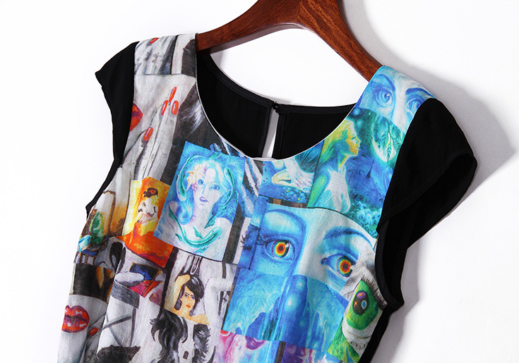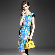 > 2015夏季新款 圆领包肩袖一粒扣套头真丝麻印花不规则修身连衣裙