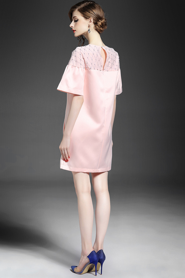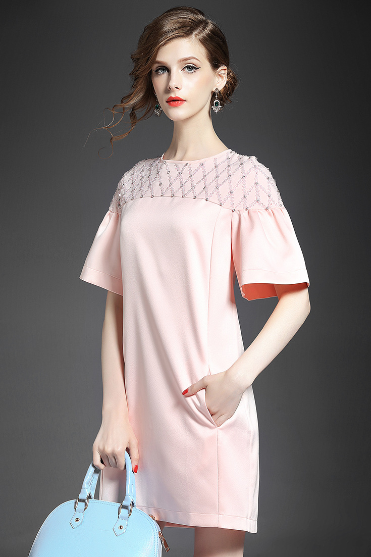 > 2015夏季新款 圆领喇叭袖小香风奢华重工钉珠镶钻纯色修身连衣裙