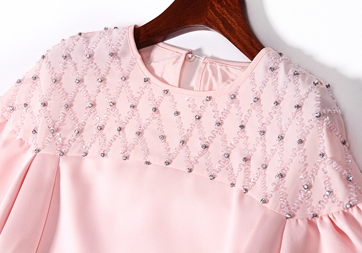 2015夏季新款 圆领喇叭袖小香风奢华重工钉珠镶钻纯色修身连衣裙