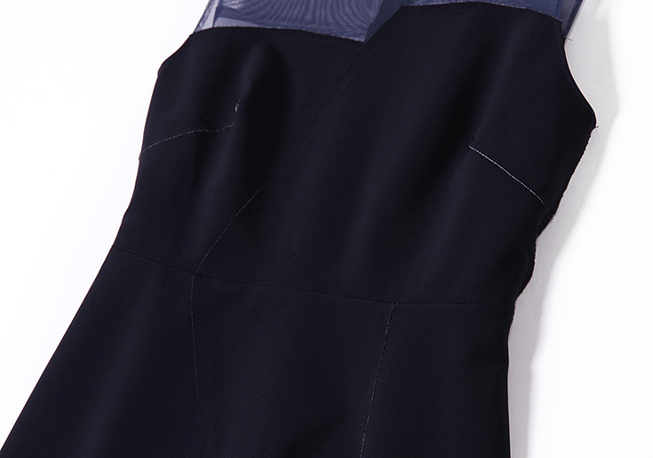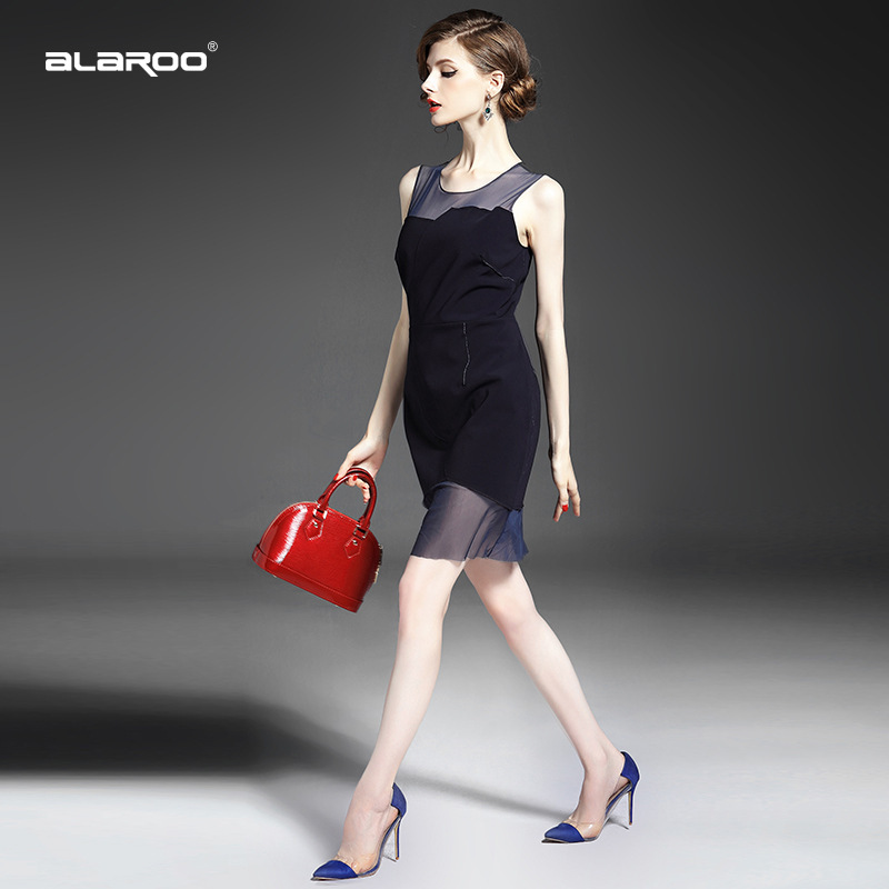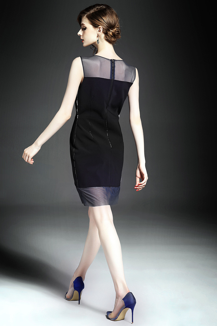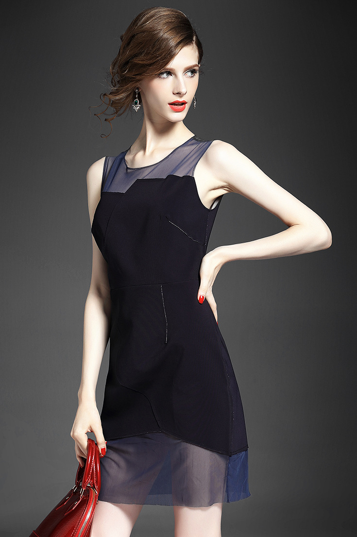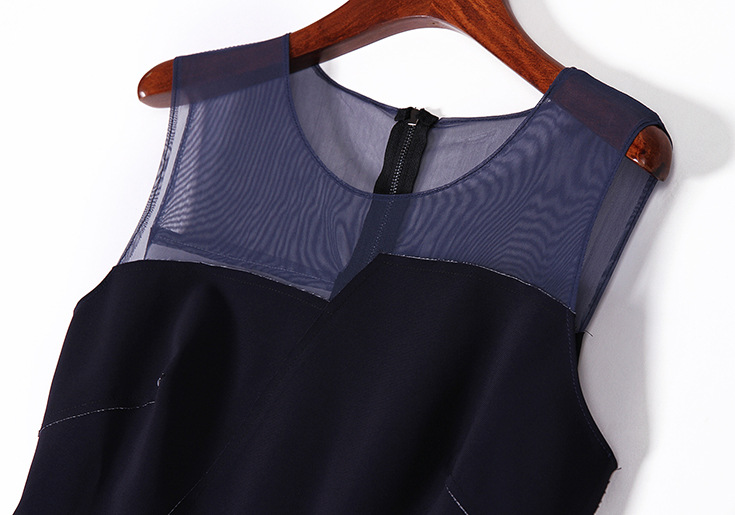2015夏季女装新款 圆领无袖网纱拼接不规则修身包臀一步裙