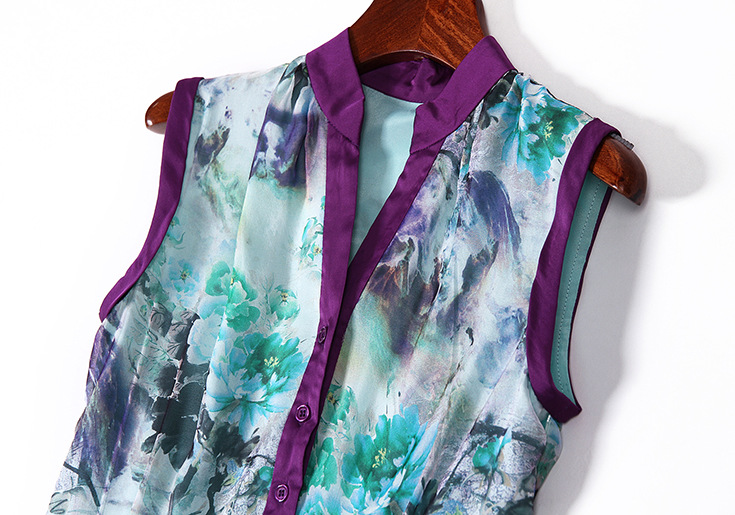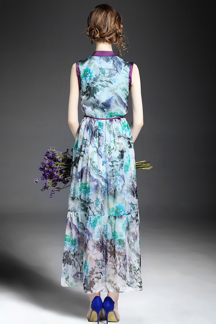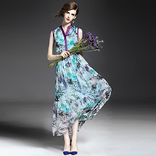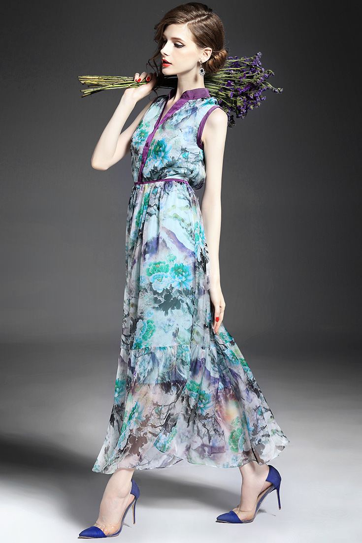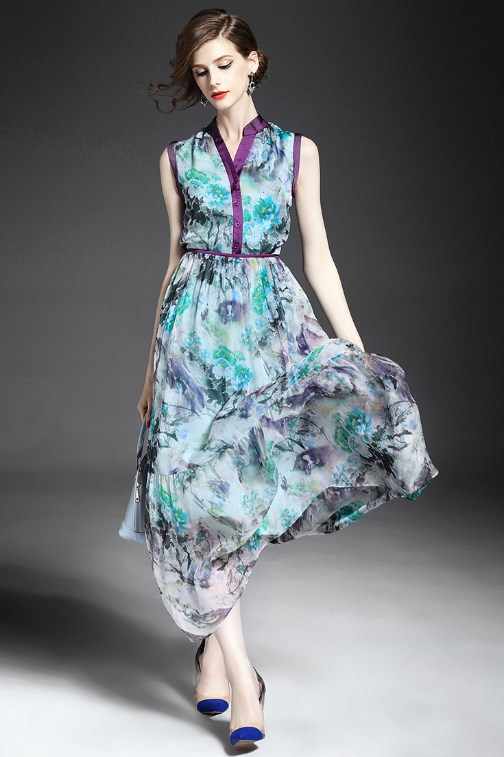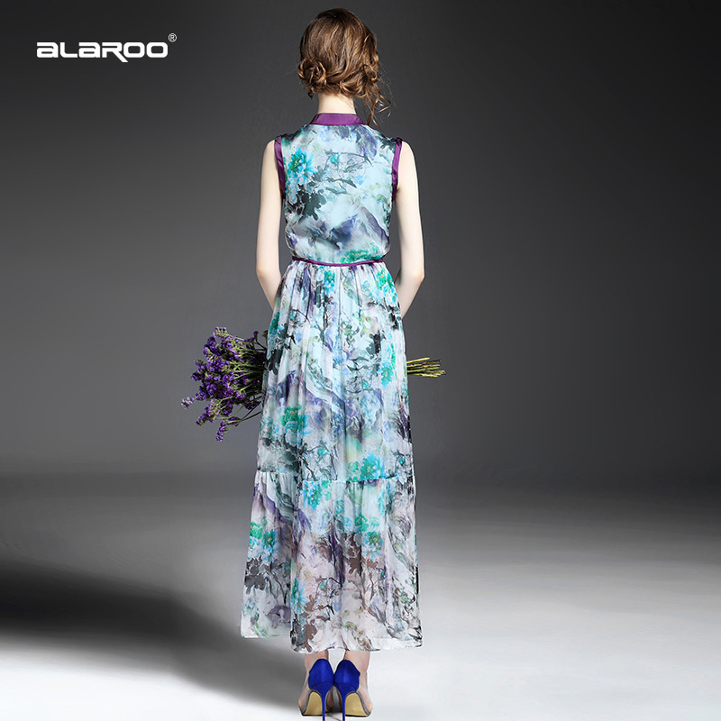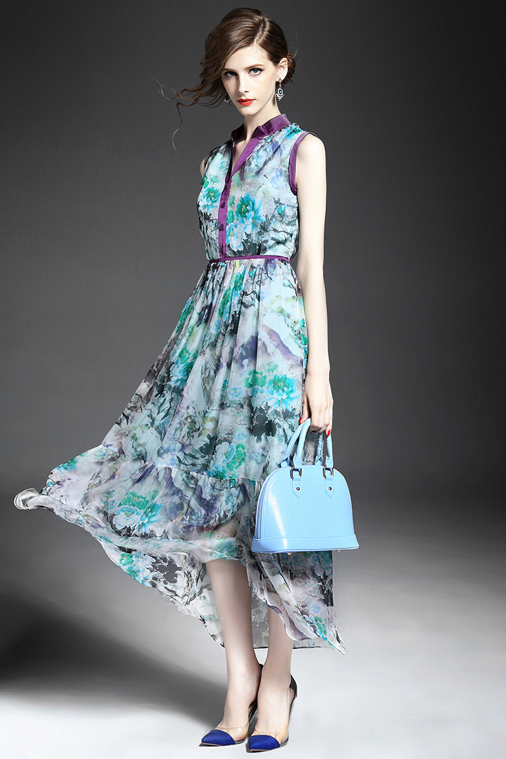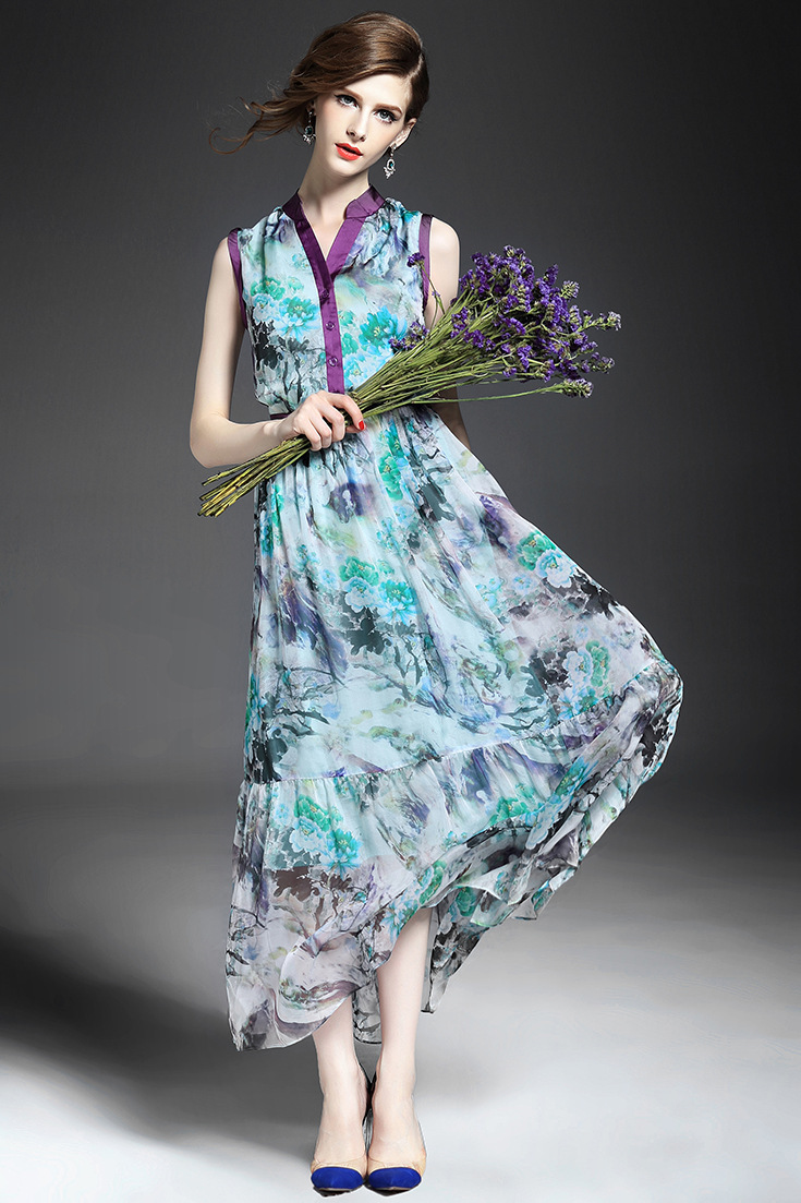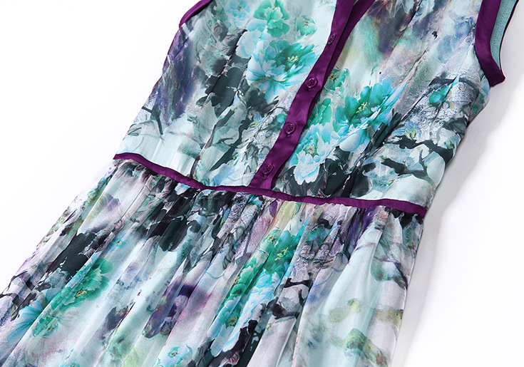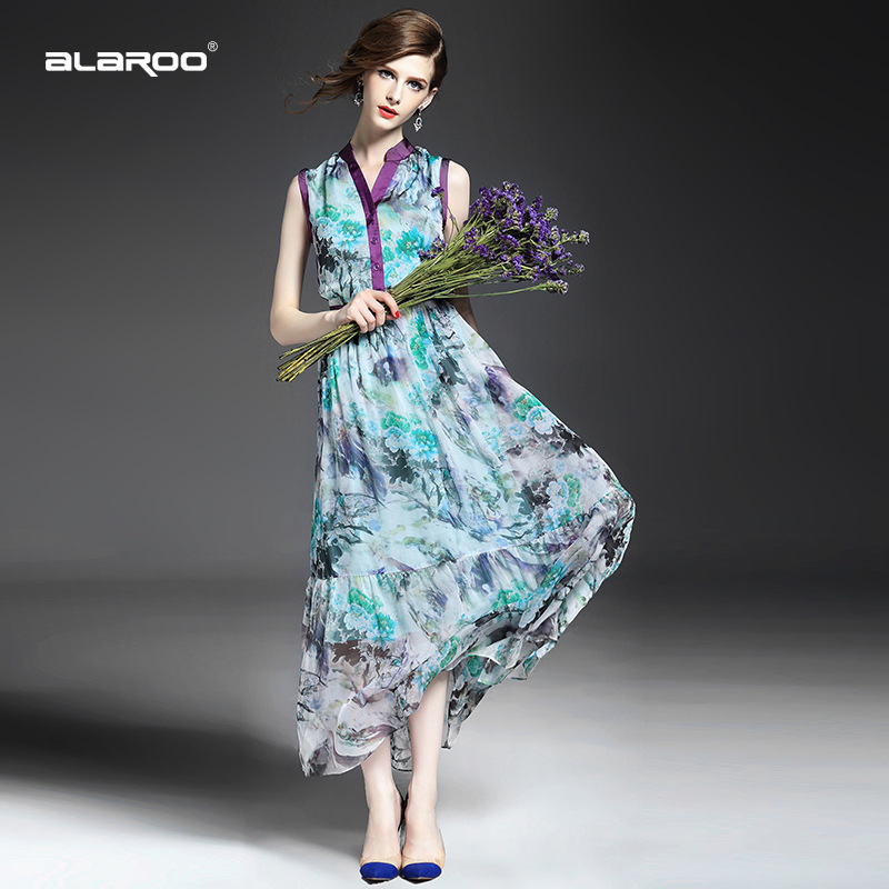 > 2015优雅气质v领单排扣收腰修身真丝印花长裙大摆不规则连衣裙夏