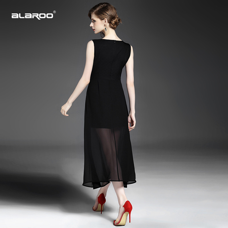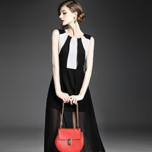 2015夏季新款 欧美大牌圆领黑白撞色乔其纱拼接假两件中长连衣裙