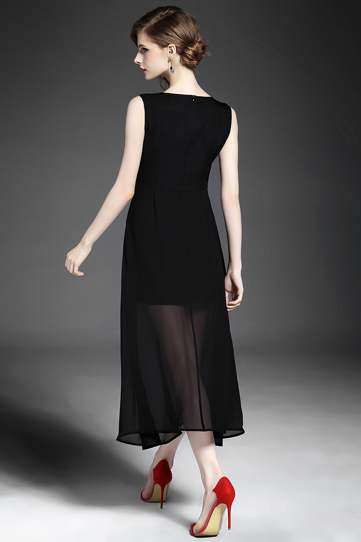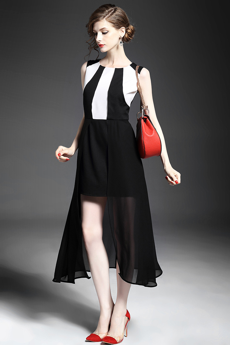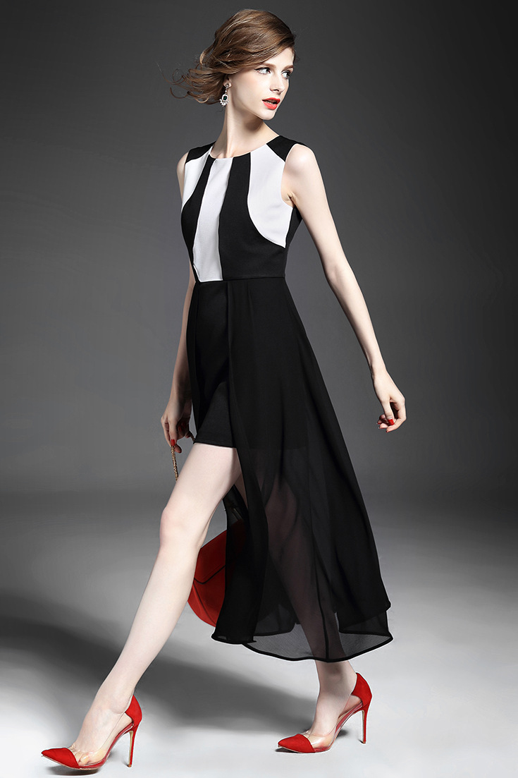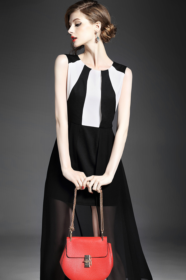 > 2015夏季新款 欧美大牌圆领黑白撞色乔其纱拼接假两件中长连衣裙