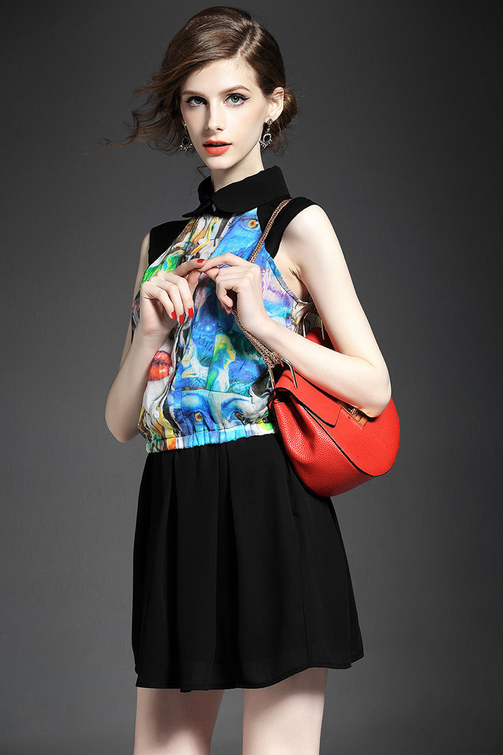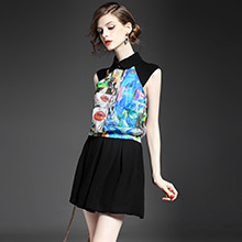 2015欧美女装无袖娃娃领气质印花弹力收腰短衬衣+纯色半裙套装夏
