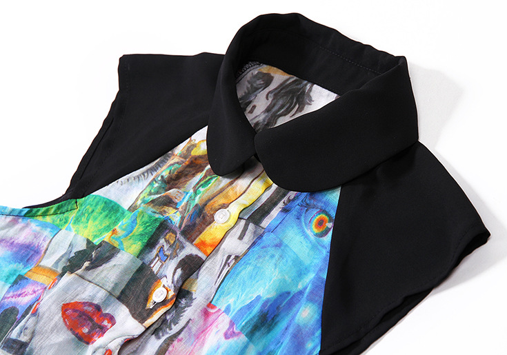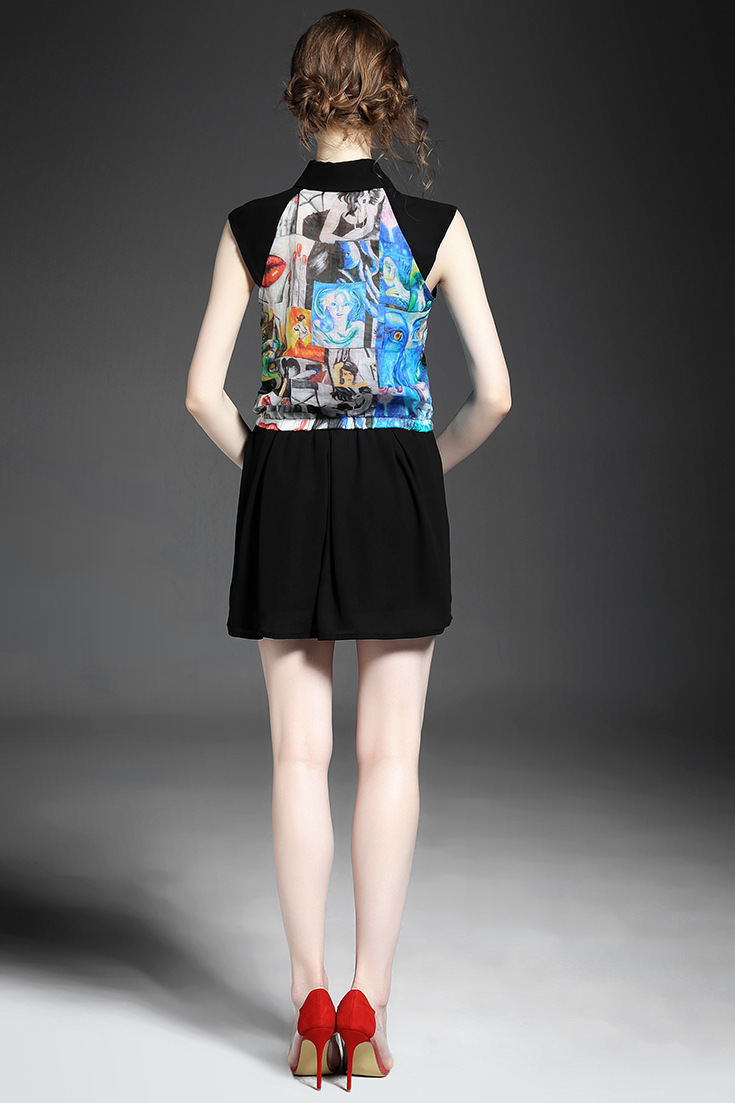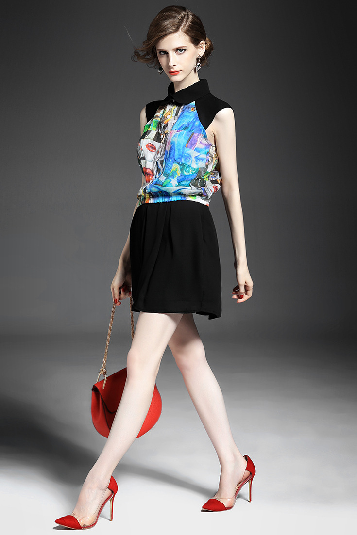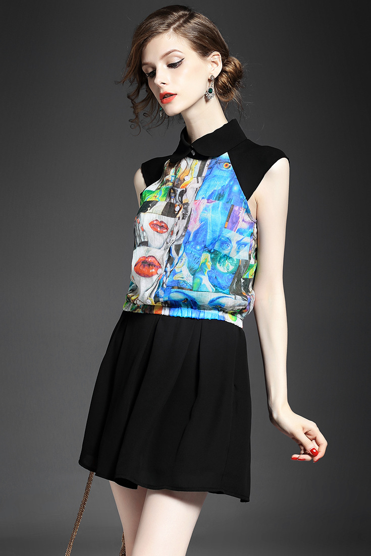 > 2015欧美女装无袖娃娃领气质印花弹力收腰短衬衣+纯色半裙套装夏