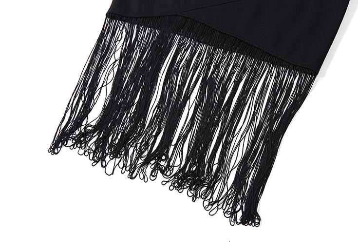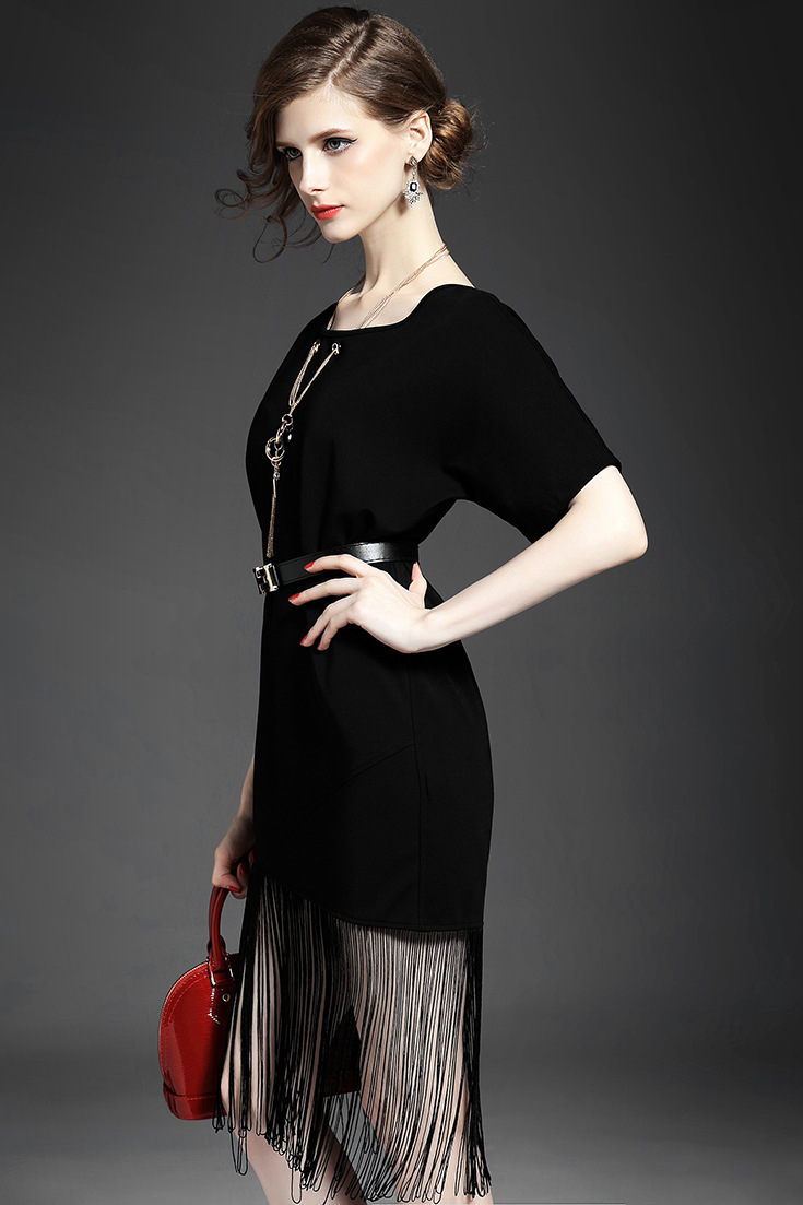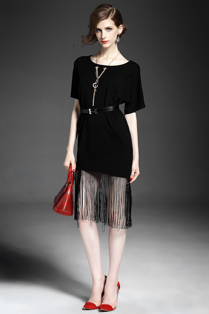 2015欧美大牌纯色圆领短袖流苏拼接弹力修身包臀一步裙夏送腰带