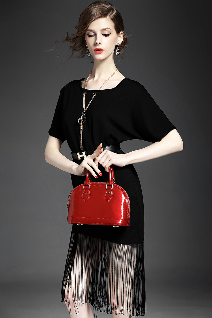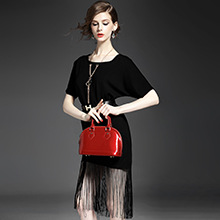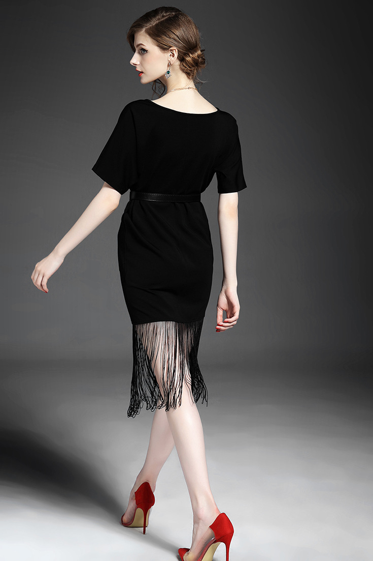 > 2015欧美大牌纯色圆领短袖流苏拼接弹力修身包臀一步裙夏送腰带
