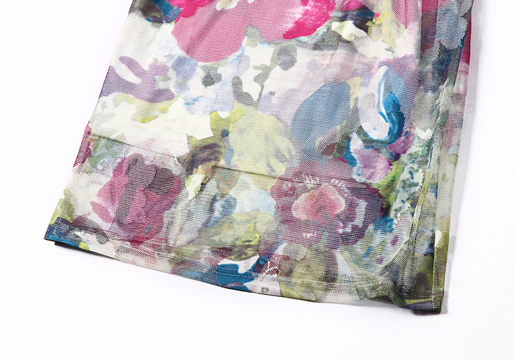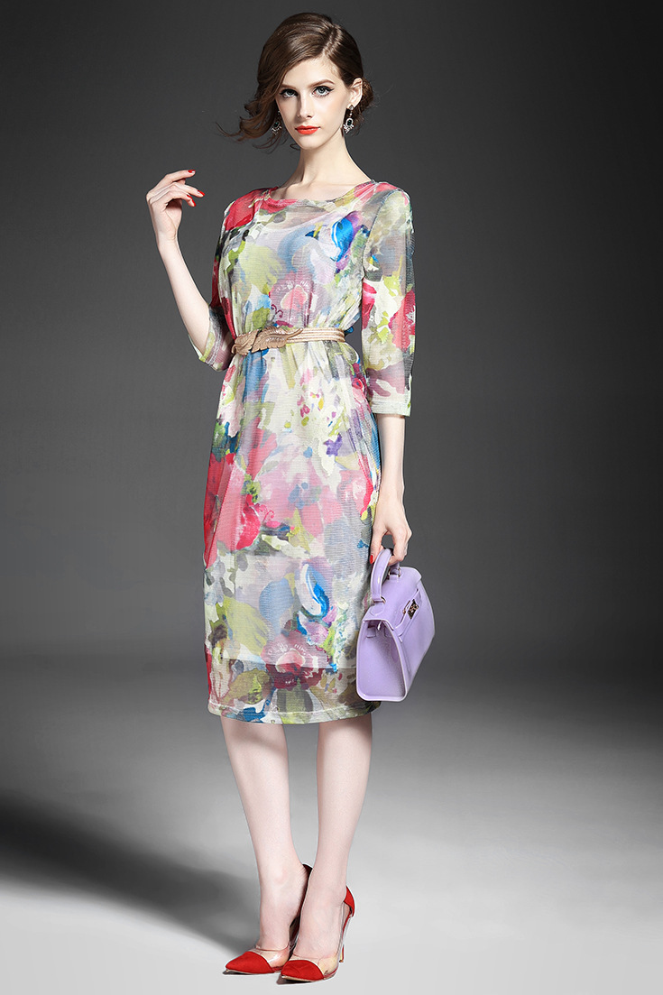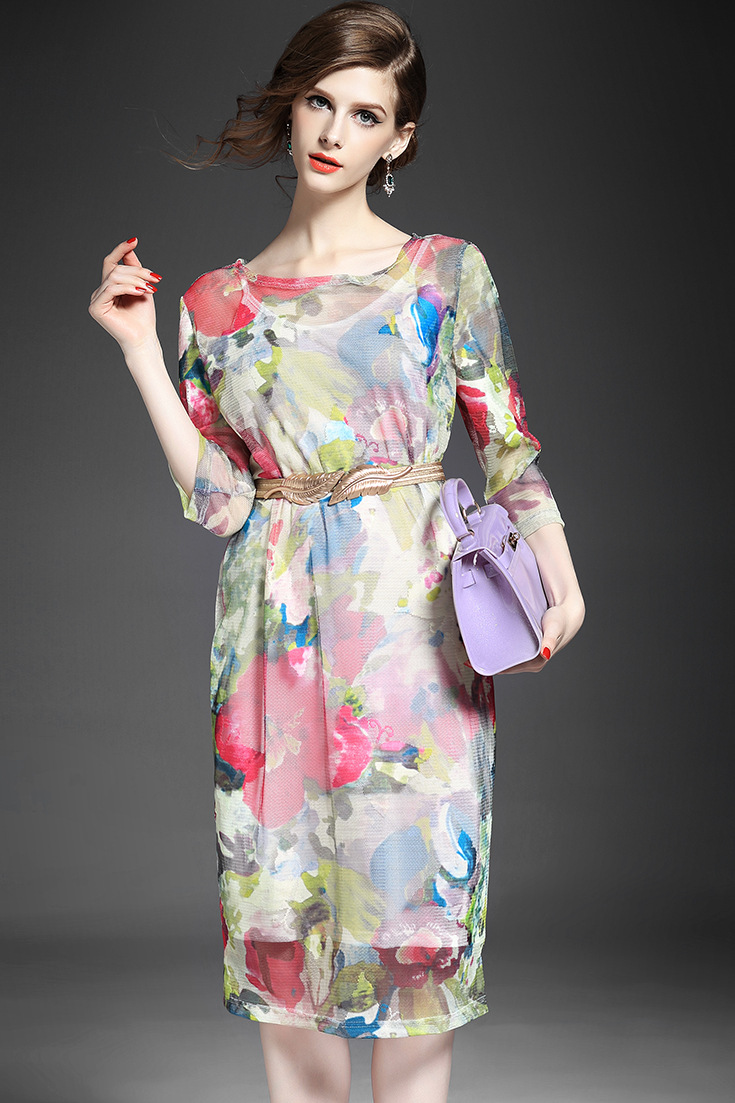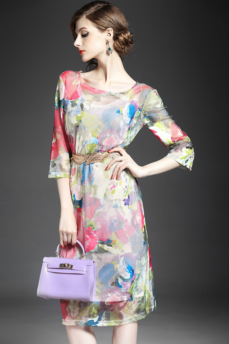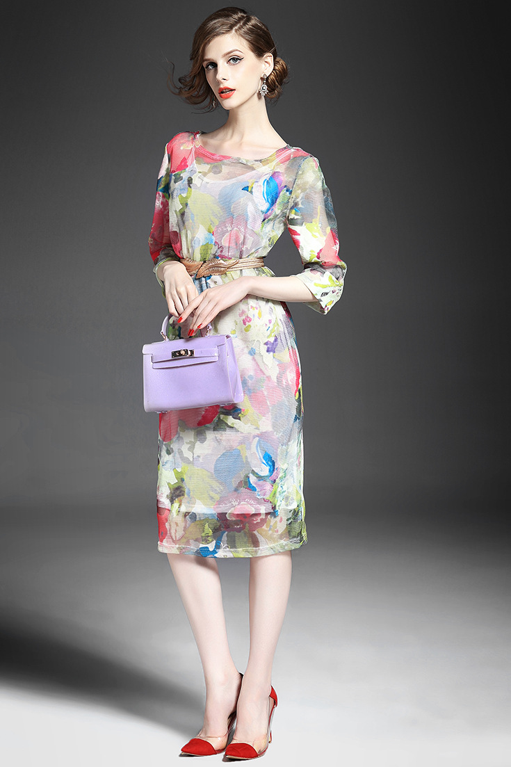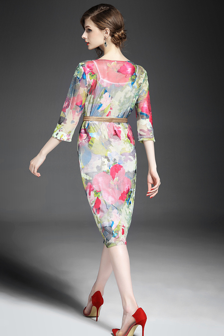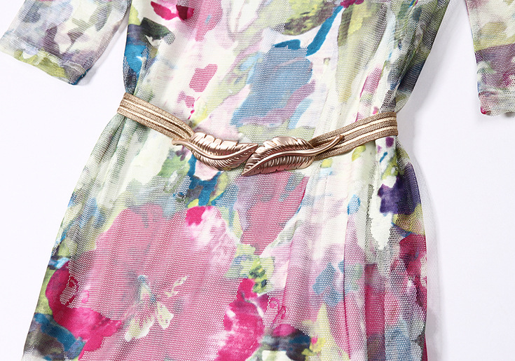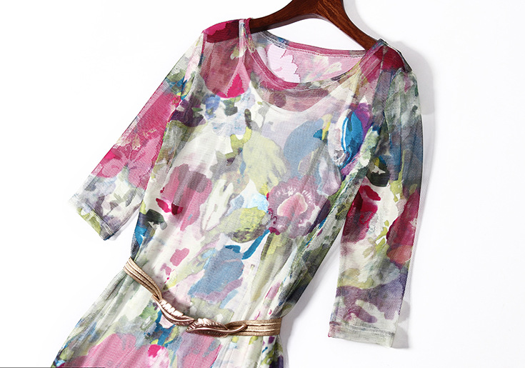 > 2015夏季新款女装 网纱印花套头束腰修身中长连衣裙送吊带