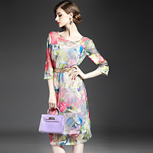 2015春夏新款欧美风印花高档桑蚕丝七分袖A字裙真丝连衣裙