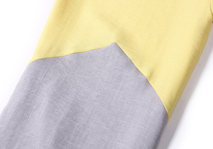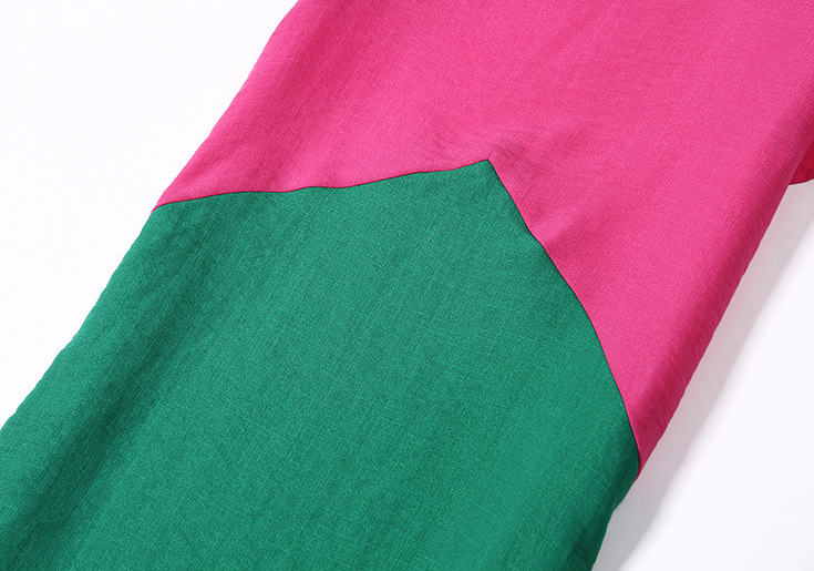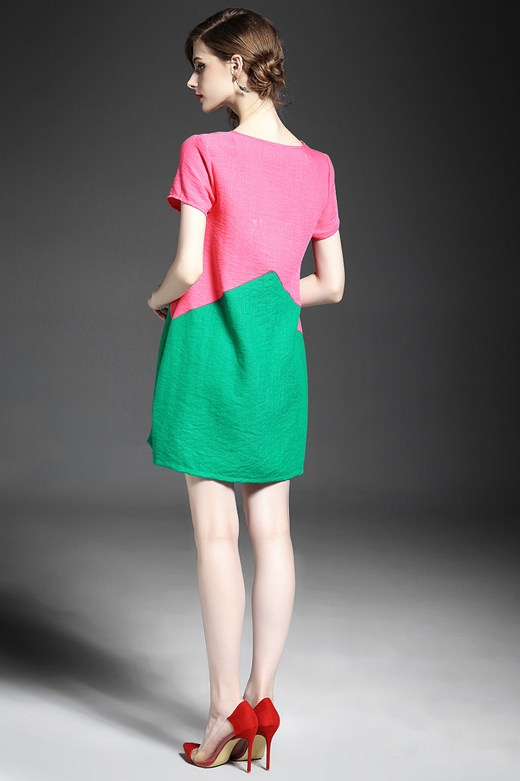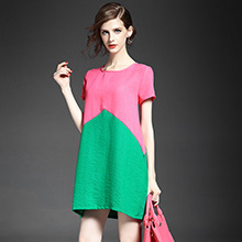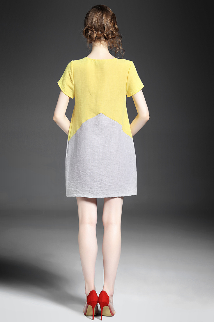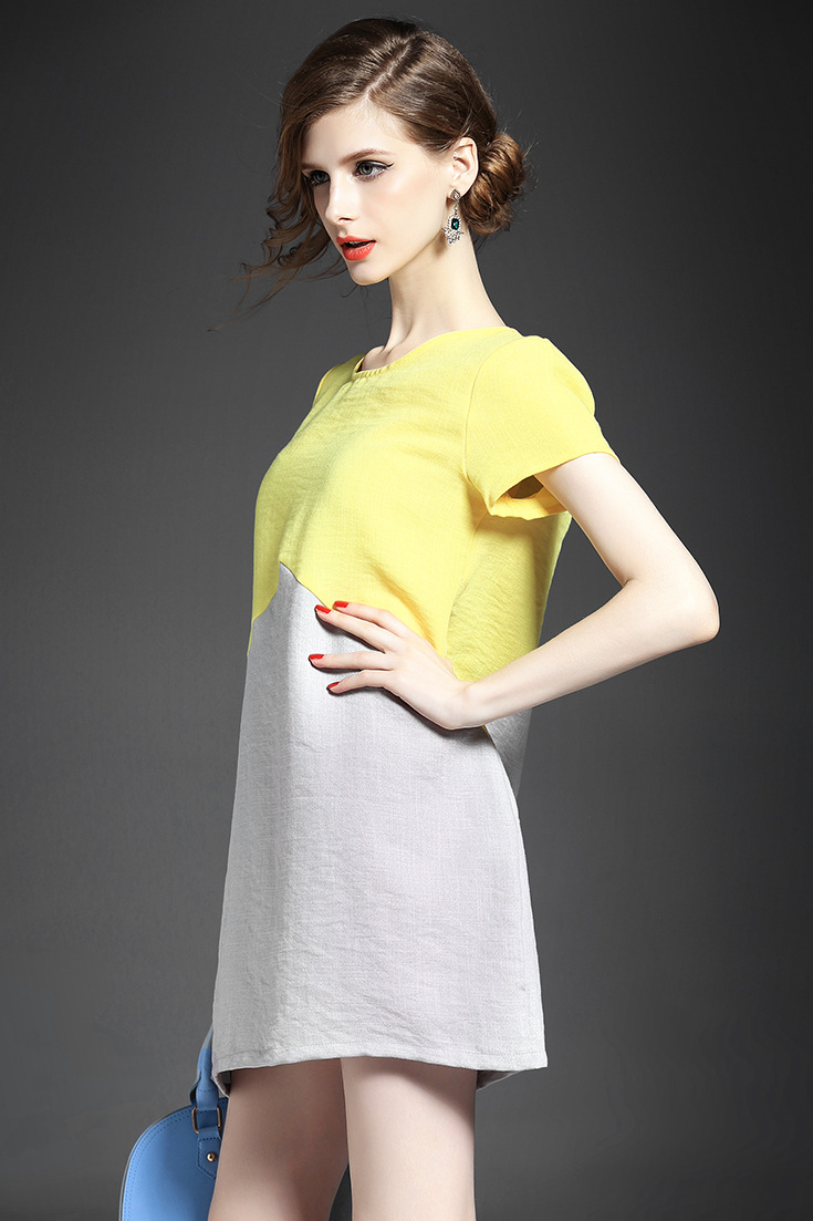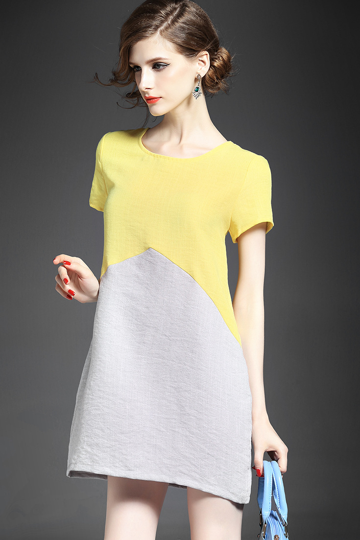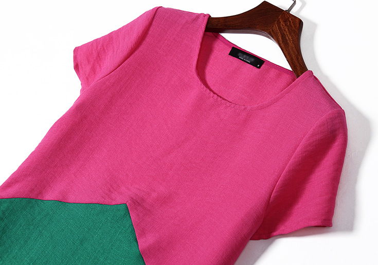> 2015夏季新款 时尚圆领短袖棉麻撞色拼接宽松娃娃裙