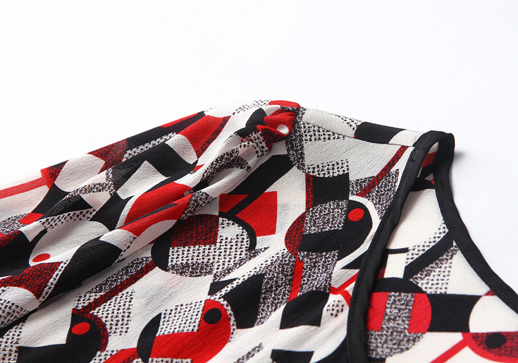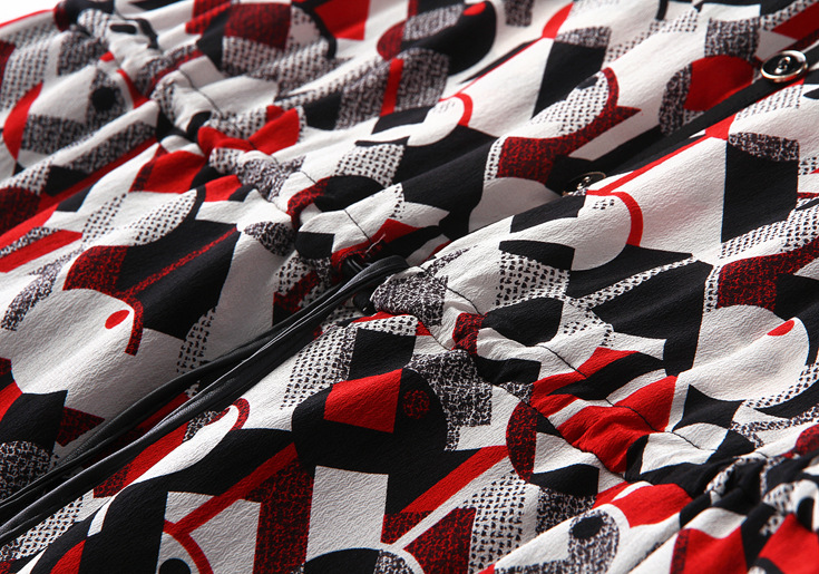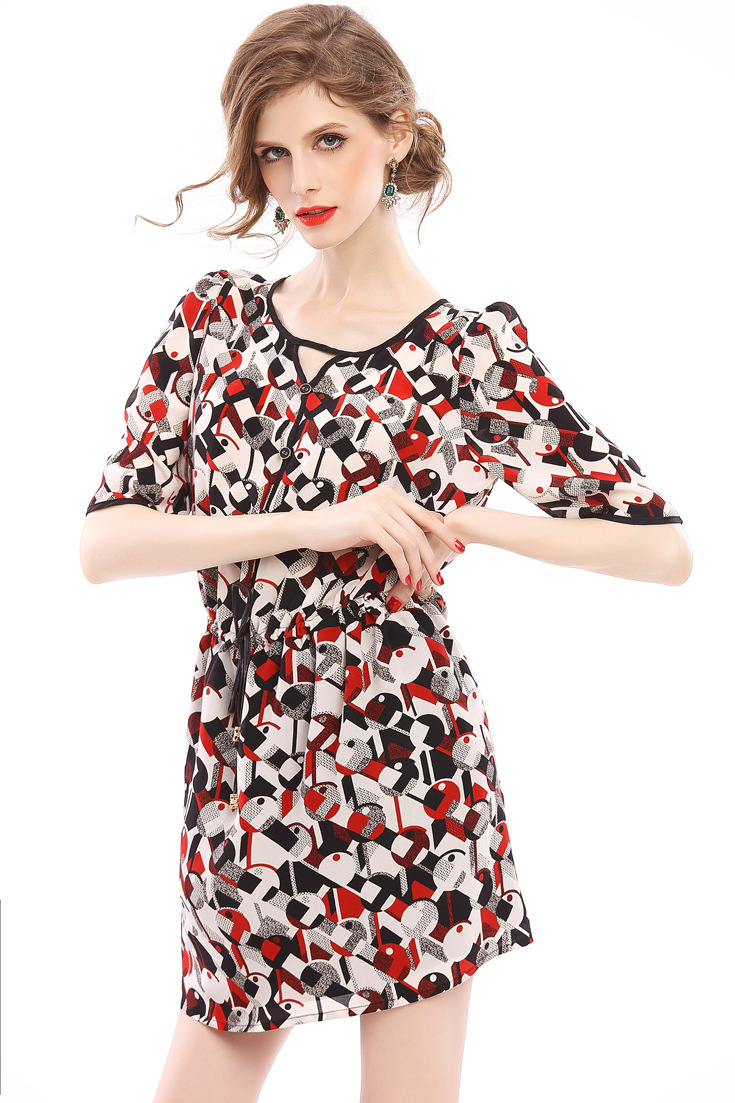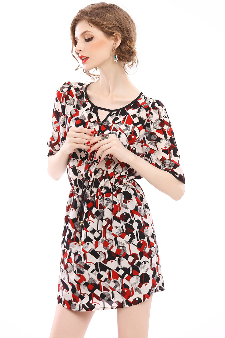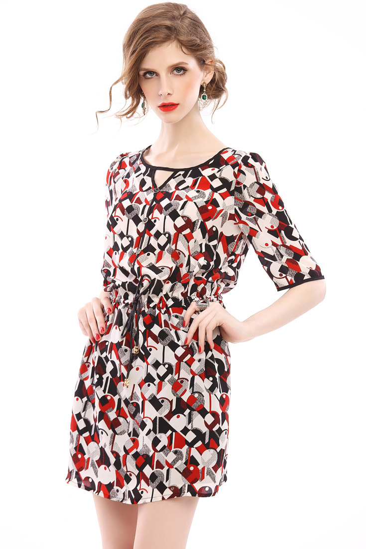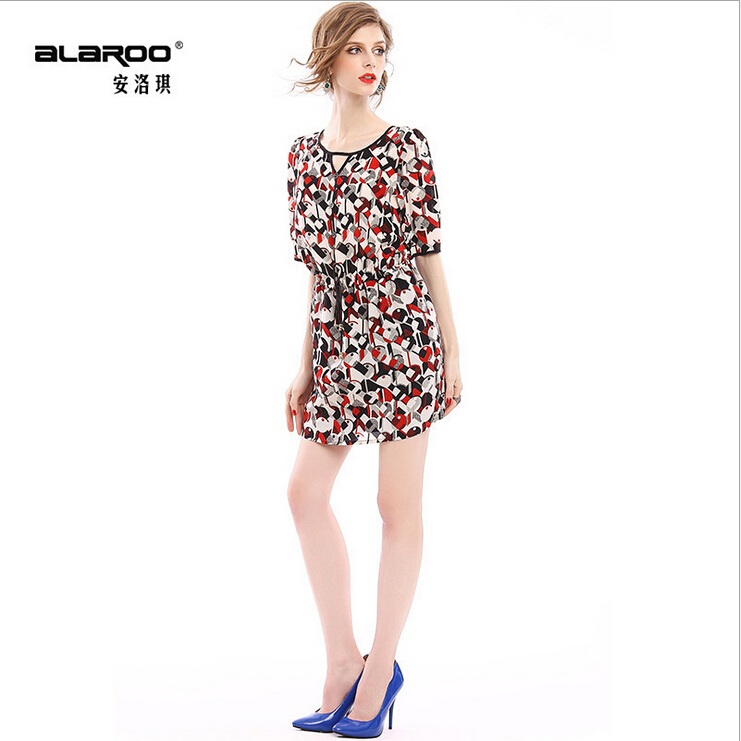 > 2015春夏新款欧美女装圆领印花弹力收腰显瘦真丝连衣裙