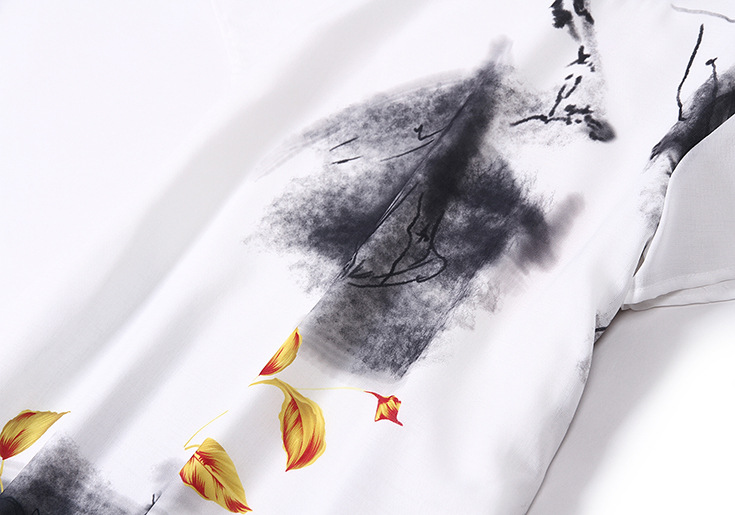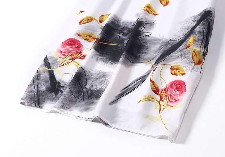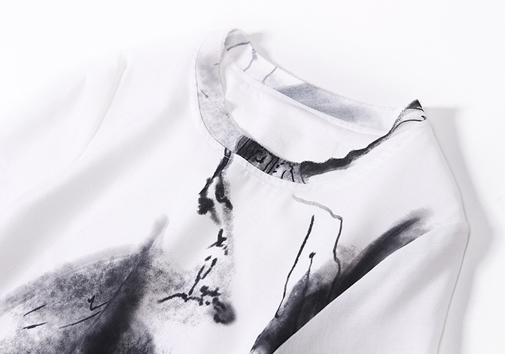 2015欧洲站夏装新款 复古中国风圆领水墨印染气质修身纯麻连衣裙
