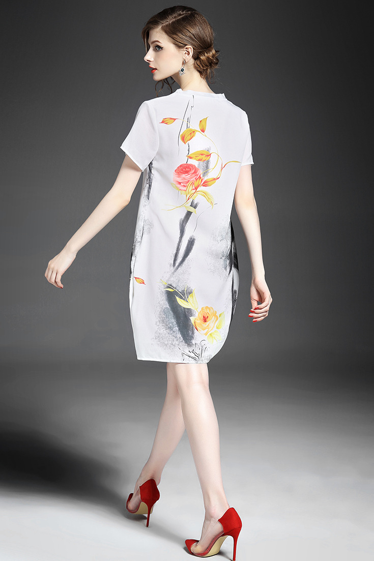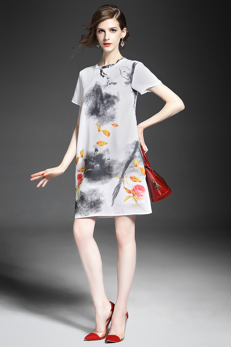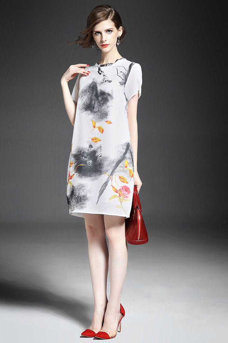 2015春夏新款欧美风印花高档桑蚕丝七分袖A字裙真丝连衣裙