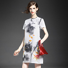 > 2015欧洲站夏装新款 复古中国风圆领水墨印染气质修身纯麻连衣裙