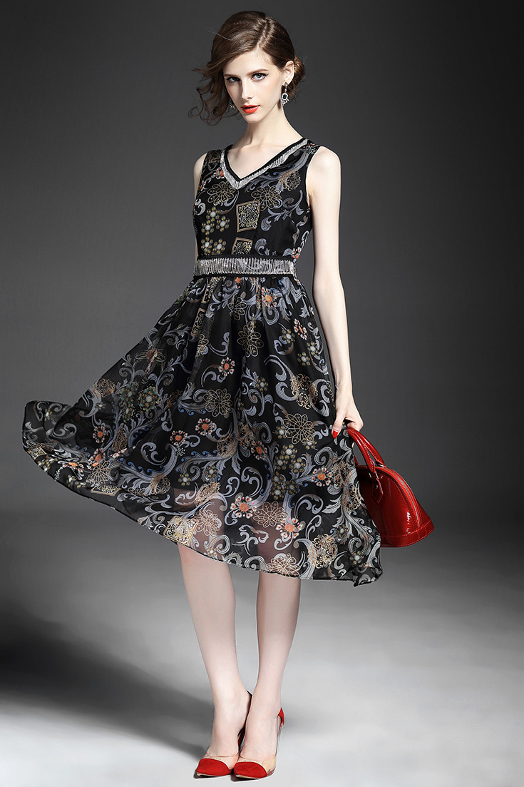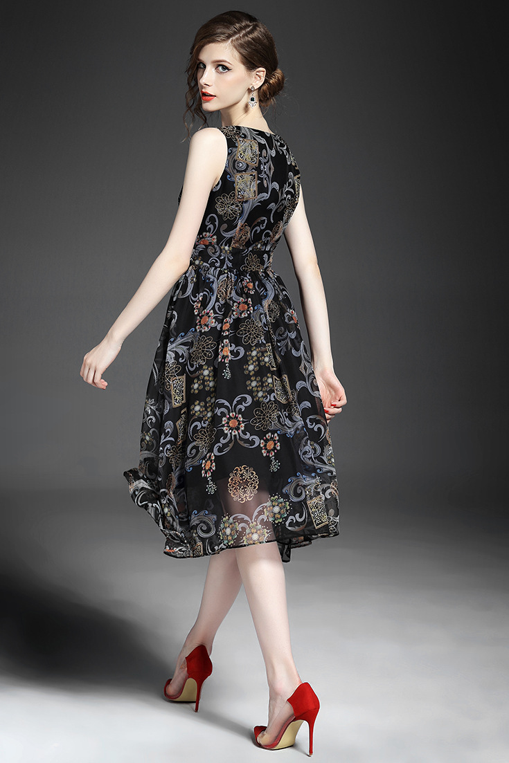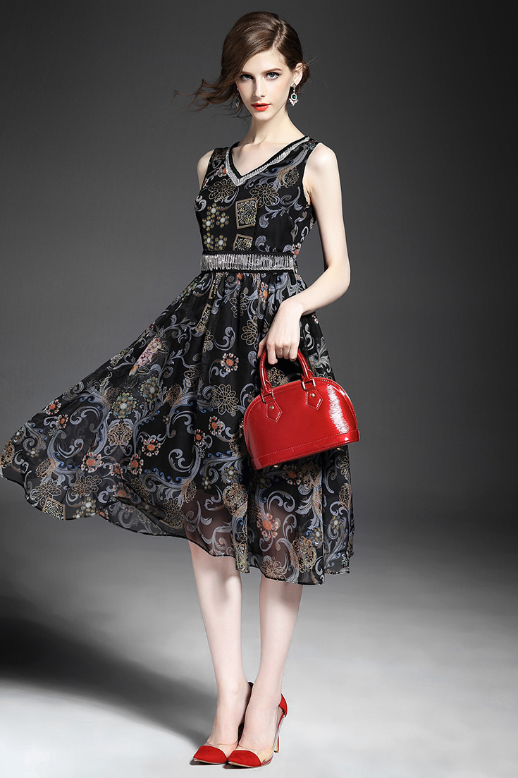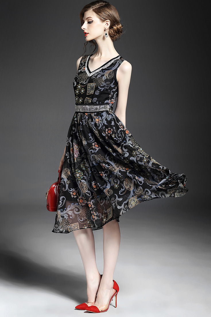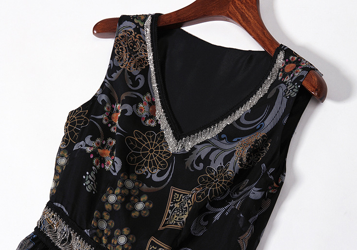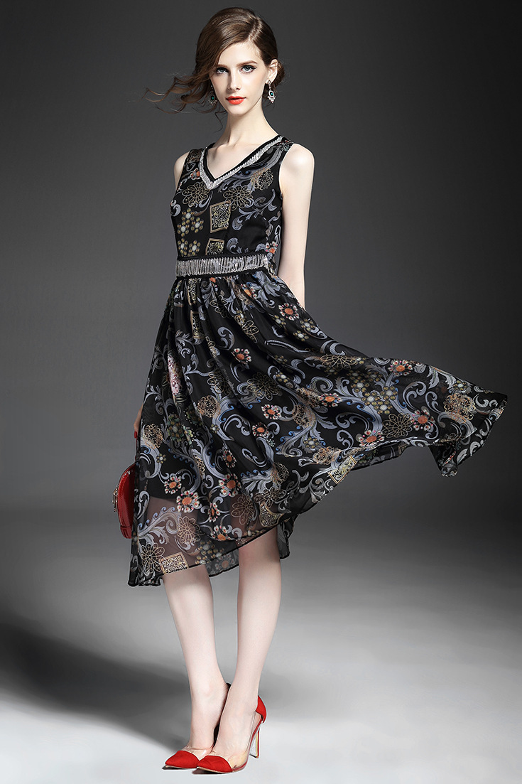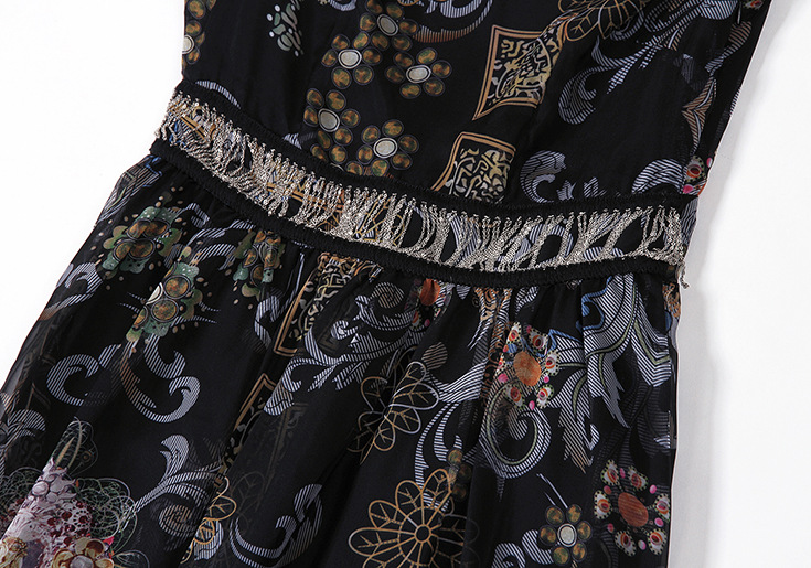 2015夏季新款 时尚V领链条拼接巴洛克印花收腰修身大摆雪纺长裙