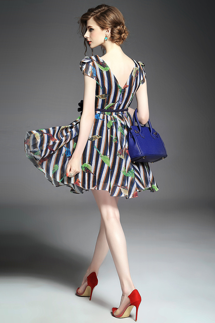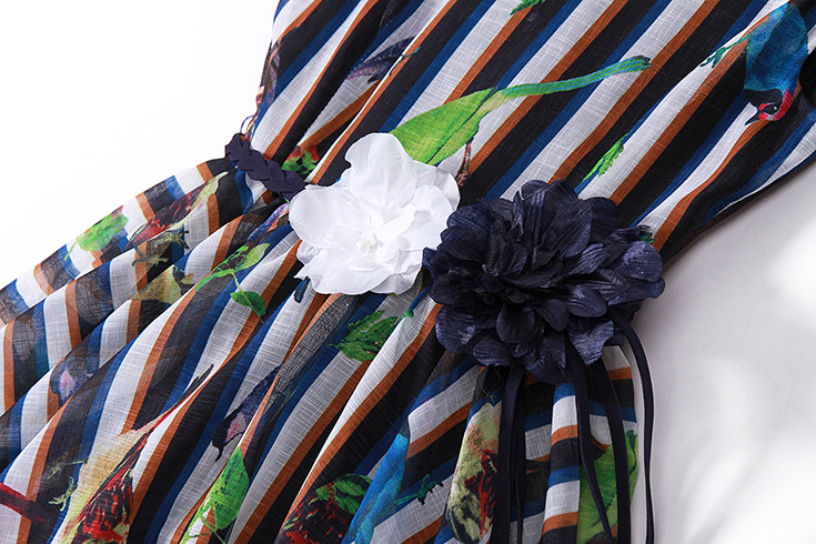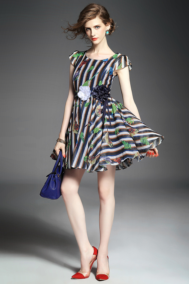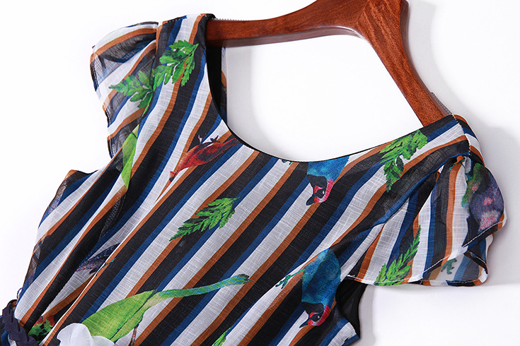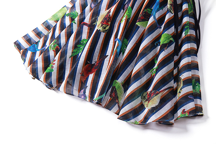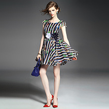 > 2015夏季女装新款 欧美高端圆领短袖撞色竖条纹印花修身大摆a字裙